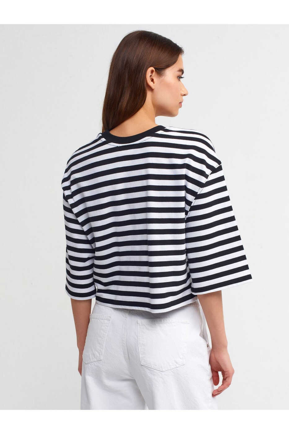 The 30282 Striped Bike Neck Crop Tshirt is a stylish way to complete your everyday style, combining comfort and trendiness. This crop t-shirt, which will complement any of your outfits with its black color and stylish stripes, reflects your daily chicness while adding a feminine touch.