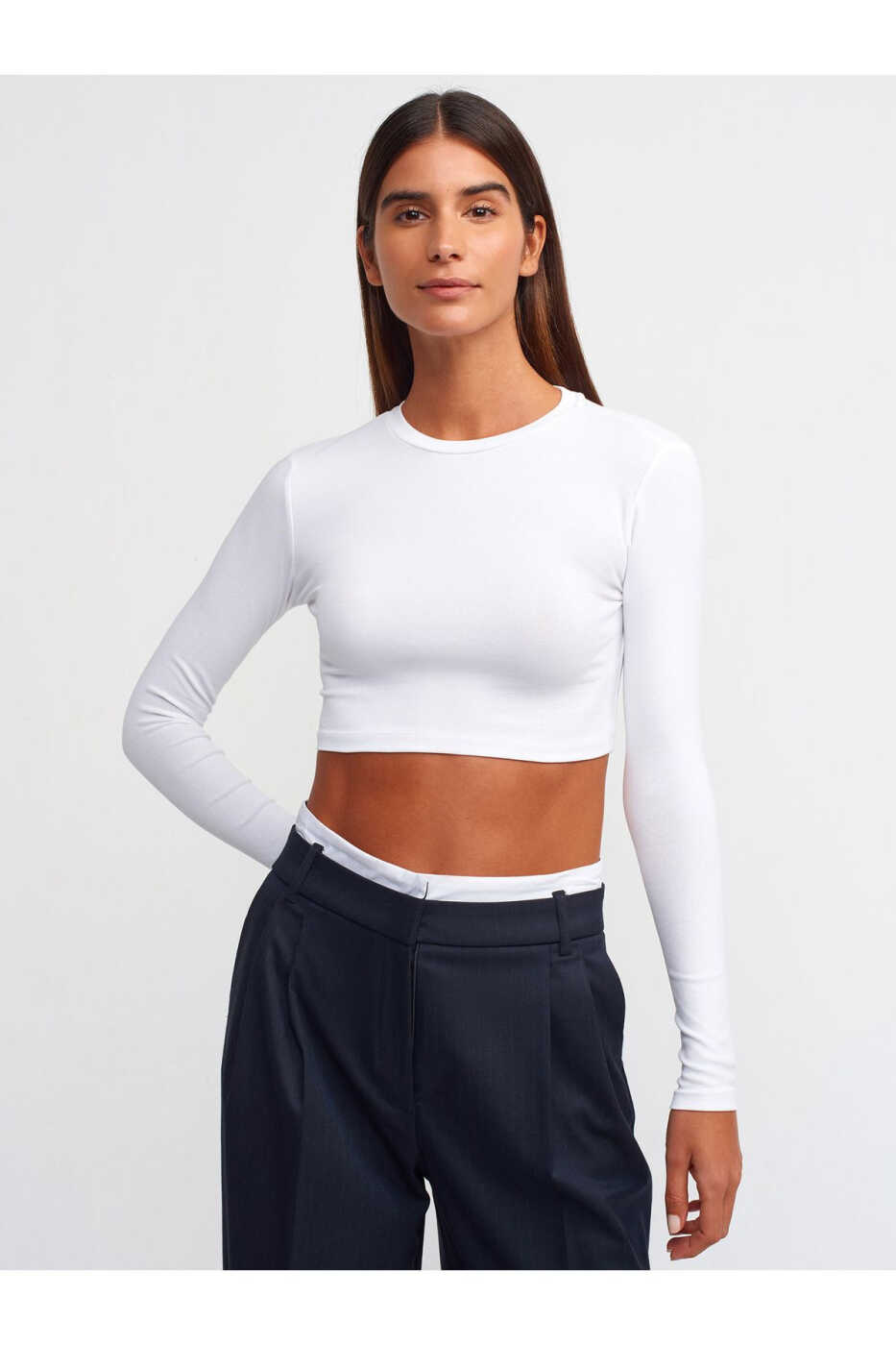 Сочетающий комфорт и стиль в повседневной жизни, топ с длинным рукавом и воротником-стойкой 30349 - Белый станет незаменимым элементом вашего гардероба благодаря своей мягкой текстуре и вневременной элегантности.