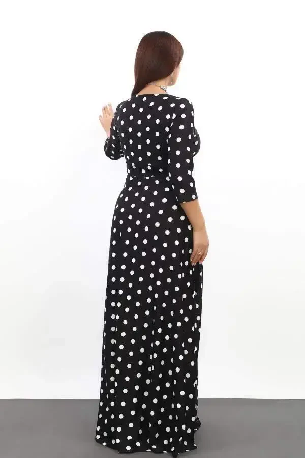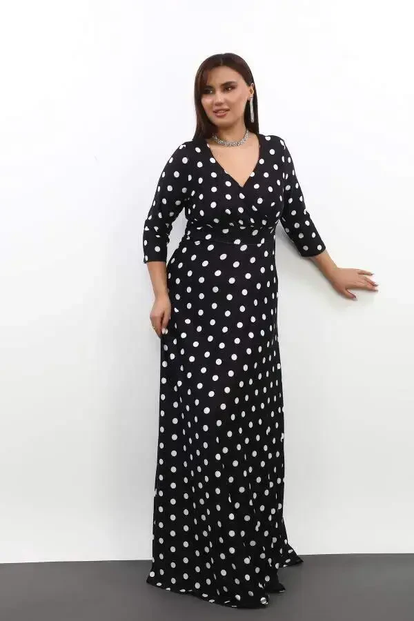 katta uzun libosi, cho'ziq nuqta naqshlari bilan bezatilgan libosi, katta uzun libosi, elastik libosi, har qanday hajmda go'zallik