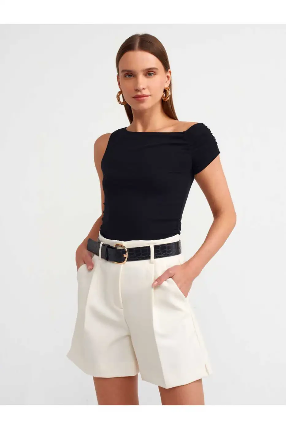 Черный цвет идеально подходит к любой комбинации, делая ее вариантом, который вы можете выбрать как для повседневной носки, так и для особых случаев. Драпировка подчеркивает талию, придавая телу изящный силуэт. Асимметричный крой добавляет современный штрих.