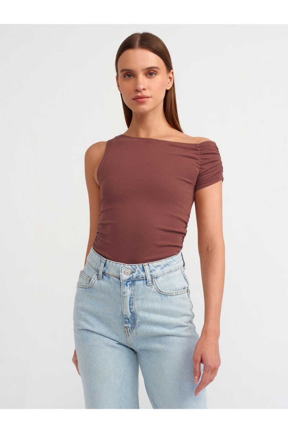 30977 Jipslangan Assimetrik Bluzka - Jigarrang - Ayollar Kiyimlari