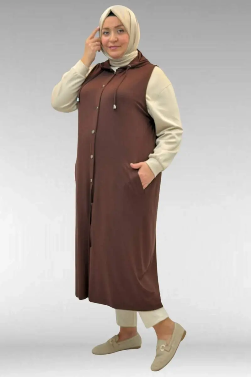 34001 Büyük Beden Çıtçıtlı Kapüşonlu Penye Yelek - Kahverengi