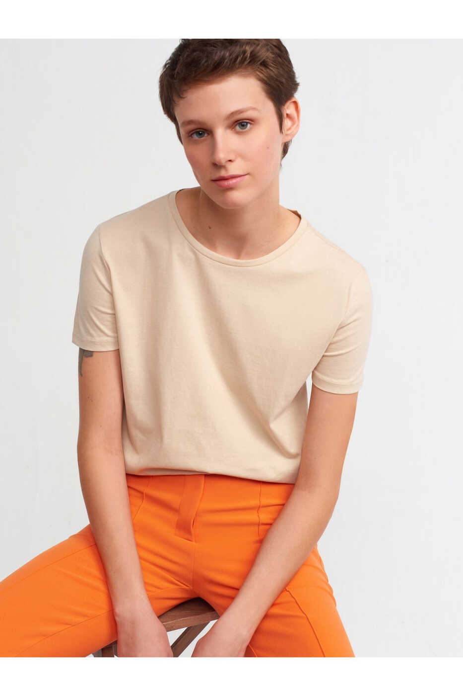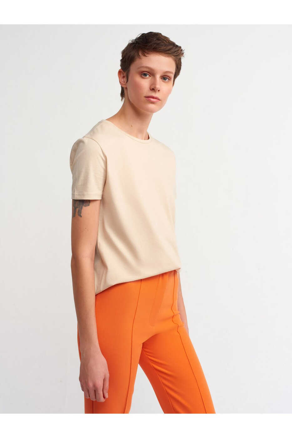 Combining style and comfort, the 3471 Bicycle Neck Basic T-shirt is the perfect choice for your everyday style. This t-shirt, with its beige color that will match any of your combinations, will keep you comfortable all day long with its soft texture and breathable fabric. The bicycle neck offers a classic and stylish look, while the minimal design on the front reflects a simple and elegant expression just like you.