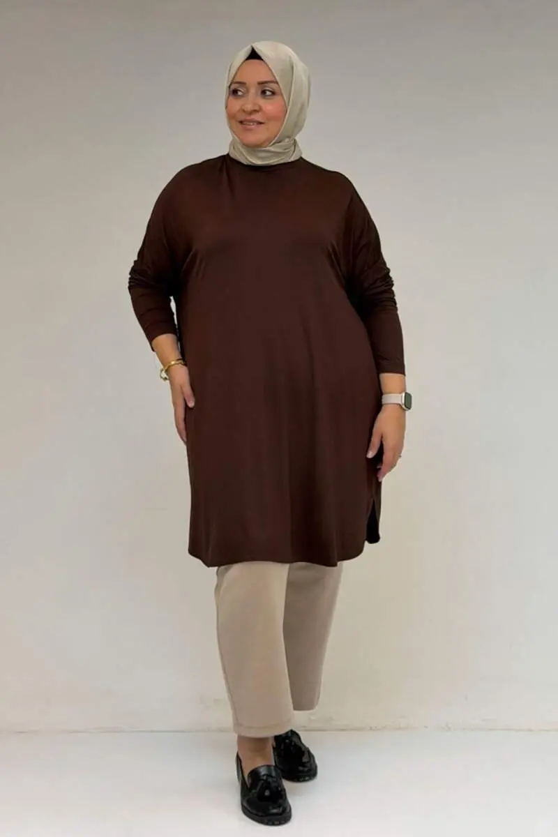 38111 Büyük Beden Basic Penye Tunik - Kahve