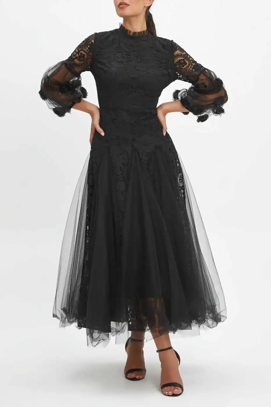 Captivate all eyes in our stunning 3D Floral and Tulle Detailed Puff Sleeve Lace Overlay Long Black Dress 40260. This exquisite dress is crafted from striking black fabric and adorned with eye-catching 3D flowers and tulle details that will make you the center of attention.The long, flowing skirt cascades elegantly as you move, creating a mesmerizing silhouette. The puffed sleeves add volume and lend a modern touch to the shoulders. The lace overlay on the bodice adds a delicate touch and accentuates your femininity.This versatile dress is perfect for a variety of occasions, from special events to business meetings. Dress it up with heels and a necklace for a sophisticated look, or dress it down with flats and a cardigan for a more casual vibe.Get your hands on this gorgeous dress now, available at a discounted campaign price of 11%! With only 5 pieces in stock, act fast. Orders exceeding 11 pieces may be subject to cancellation. Enjoy free returns within 15 days.