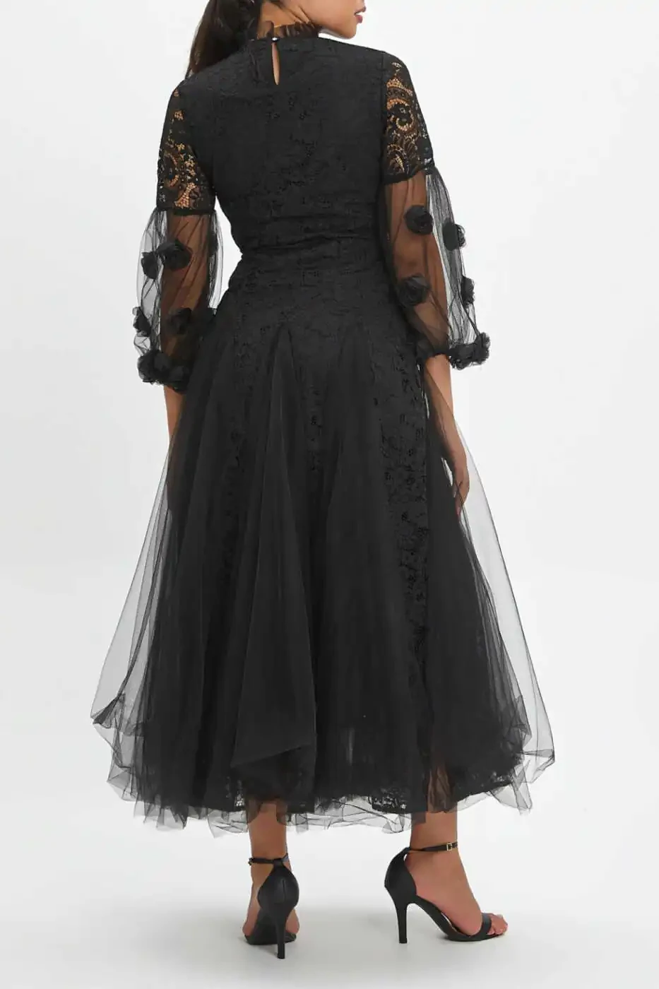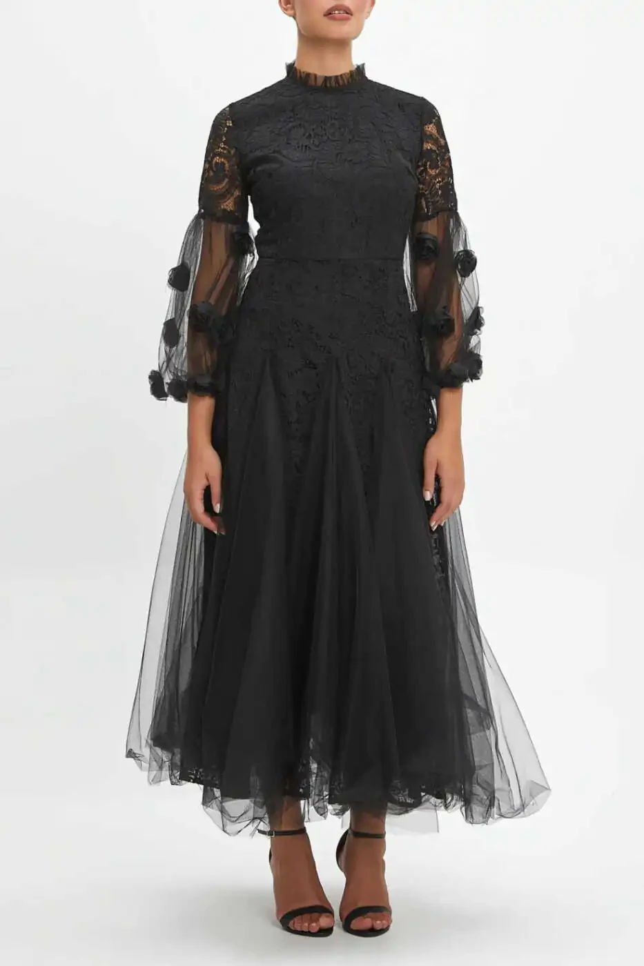 3D gullar bilan bezatilgan uzun qora ko'ylak: maxsus kunlaringiz uchun nafis va ajoyib