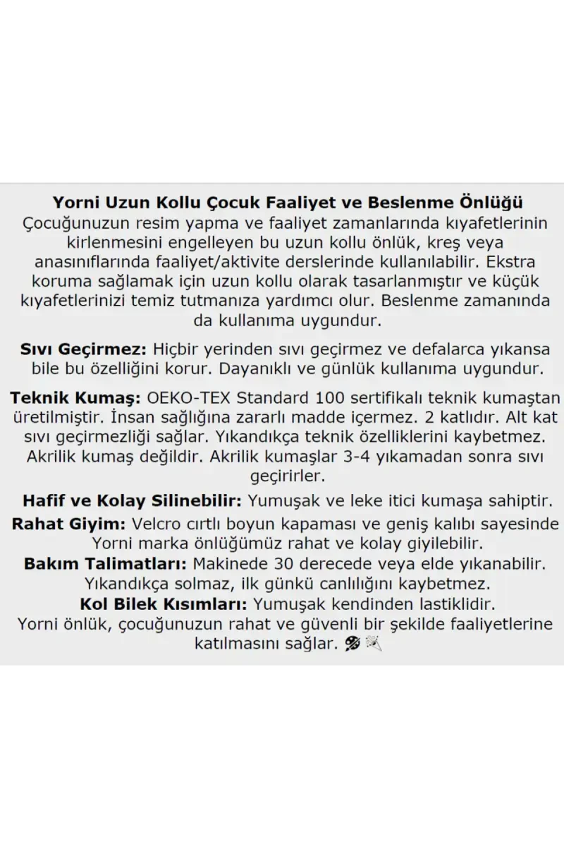You can be sure that the product does not contain any harmful substances. Oeko-Tex Standard 100 certified fabric does not harm your child's sensitive skin and you can use it safely. Produced in European standards, this apron will meet your expectations in terms of quality and durability. The wrists are soft rubberized, so the sleeves do not slip and allow your child to move comfortably. It is not recommended to put it in the dryer, thus ensuring the long life of the apron. With this apron, you can keep your child's clothes clean without limiting their creativity.