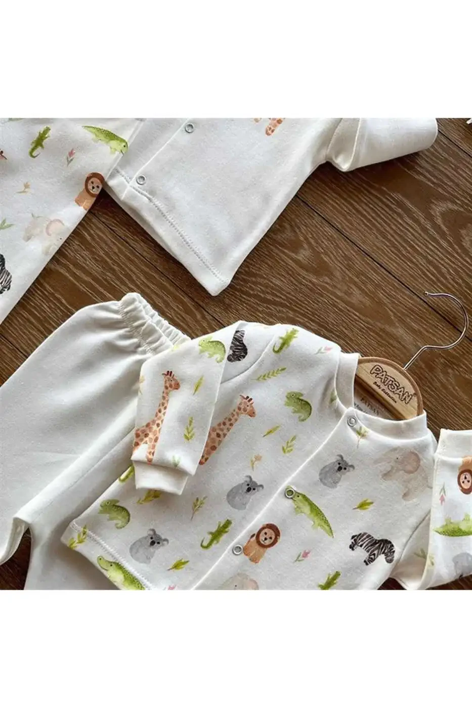 Meet our 4-piece pajama set, made from 100% organic cotton, designed to ensure the sweetest dreams for your little one! Adorned with giraffe, lion, and chameleon motifs, this cheerful set will gently caress your baby's delicate skin and provide all-day comfort. Produced with the assurance of RENKLİ PUSET by PATSAN, this high-quality pajama set stands out with its stylish and practical design. Its flexible structure allows your baby to move freely, and its non-sweating feature makes it ideal for both night and day use. With Oeko-Tex certified, carcinogen-free yarns and nickel-free snaps, we prioritize your baby's health above all else. Produced in Turkey under women's leadership, this special pajama set is prepared with love and care. This 4-piece set, specially designed for your child's safety and comfort, consists of 2 single jersey baby cardigans and 2 single jersey footed baby pajamas. With its soft texture, this magnificent set offers the most delicate touch to your baby's skin and is produced to maintain its quality even after each wash. By following the appropriate washing instructions, you will make it your baby's favorite pajama set for years to come. What are you waiting for? Order this special set now and accompany your baby's sweet sleep! Our stock is limited, hurry!