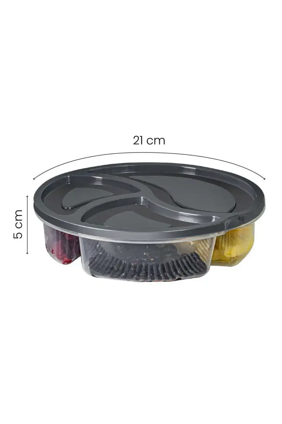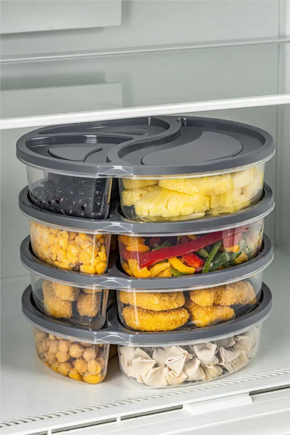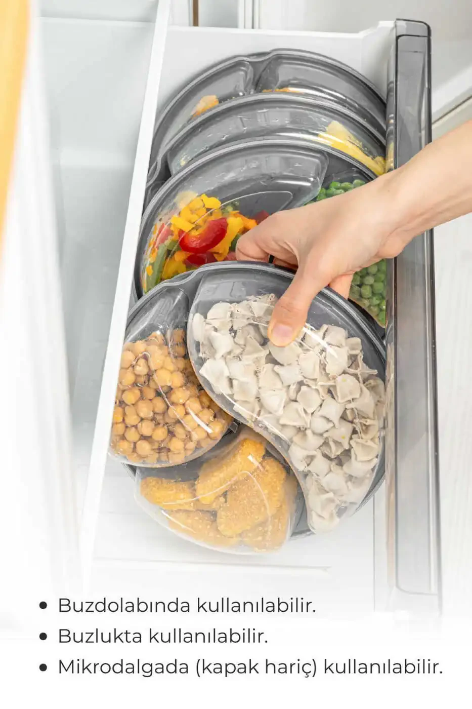 Упростите организацию своей кухни и храните еду с заботой! Наш 4-х Комплект Круглых Контейнеров для Хранения с 3 Отсеками, благодаря практичному дизайну и большой вместимости, удовлетворит любые потребности. Этот набор, который добавит стильный штрих вашей кухне своим антрацитовым цветом, подходит для использования в микроволновой печи и посудомоечной машине.