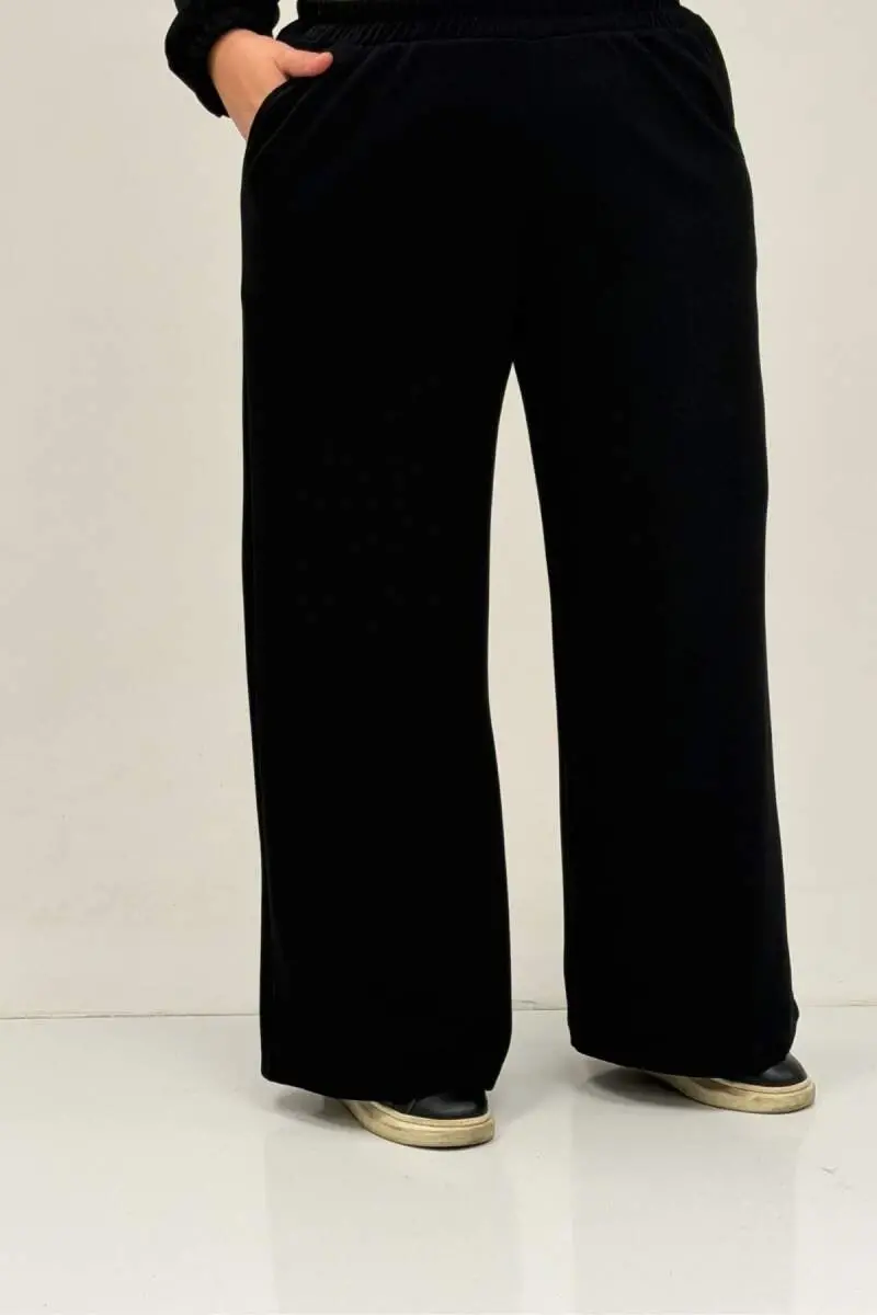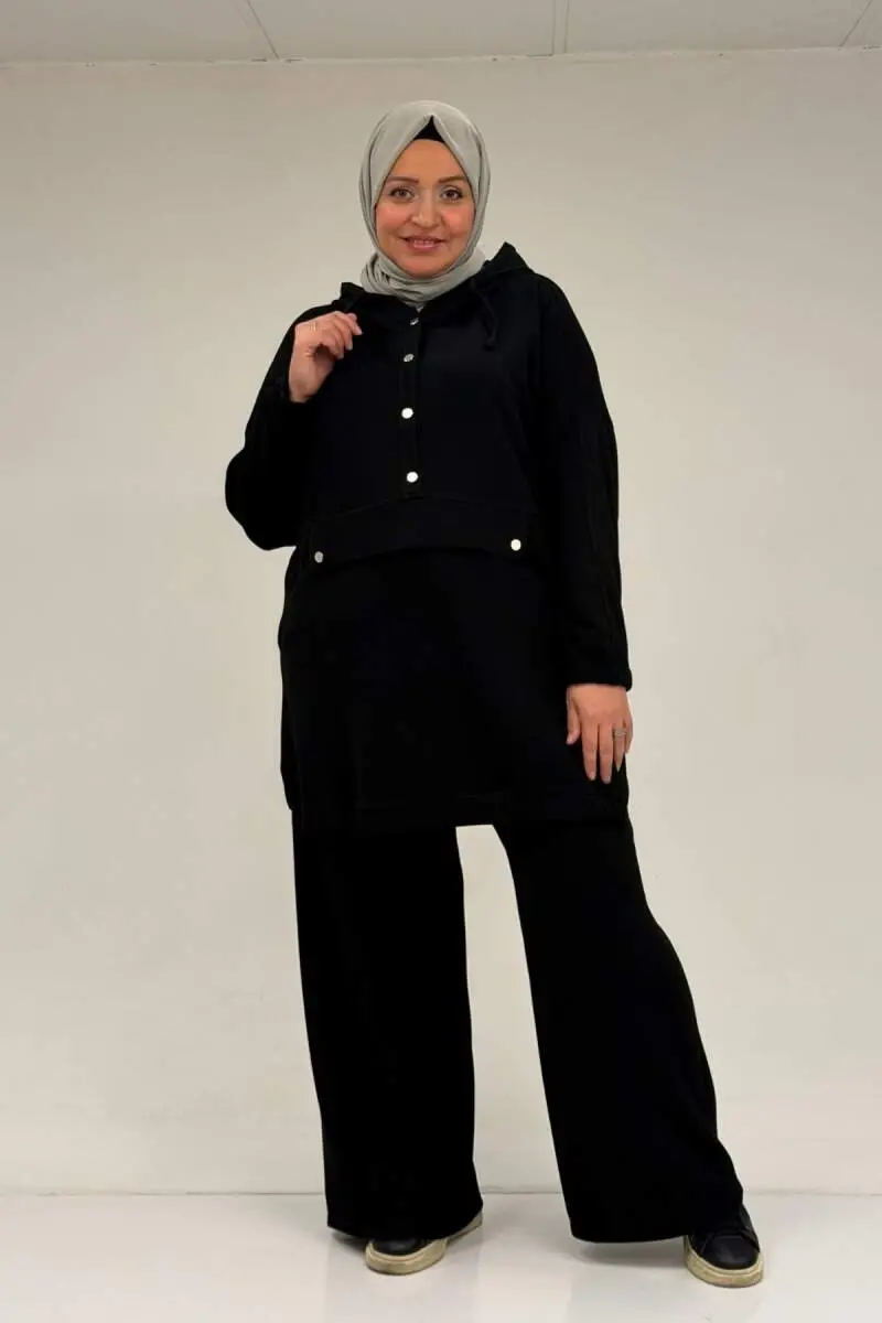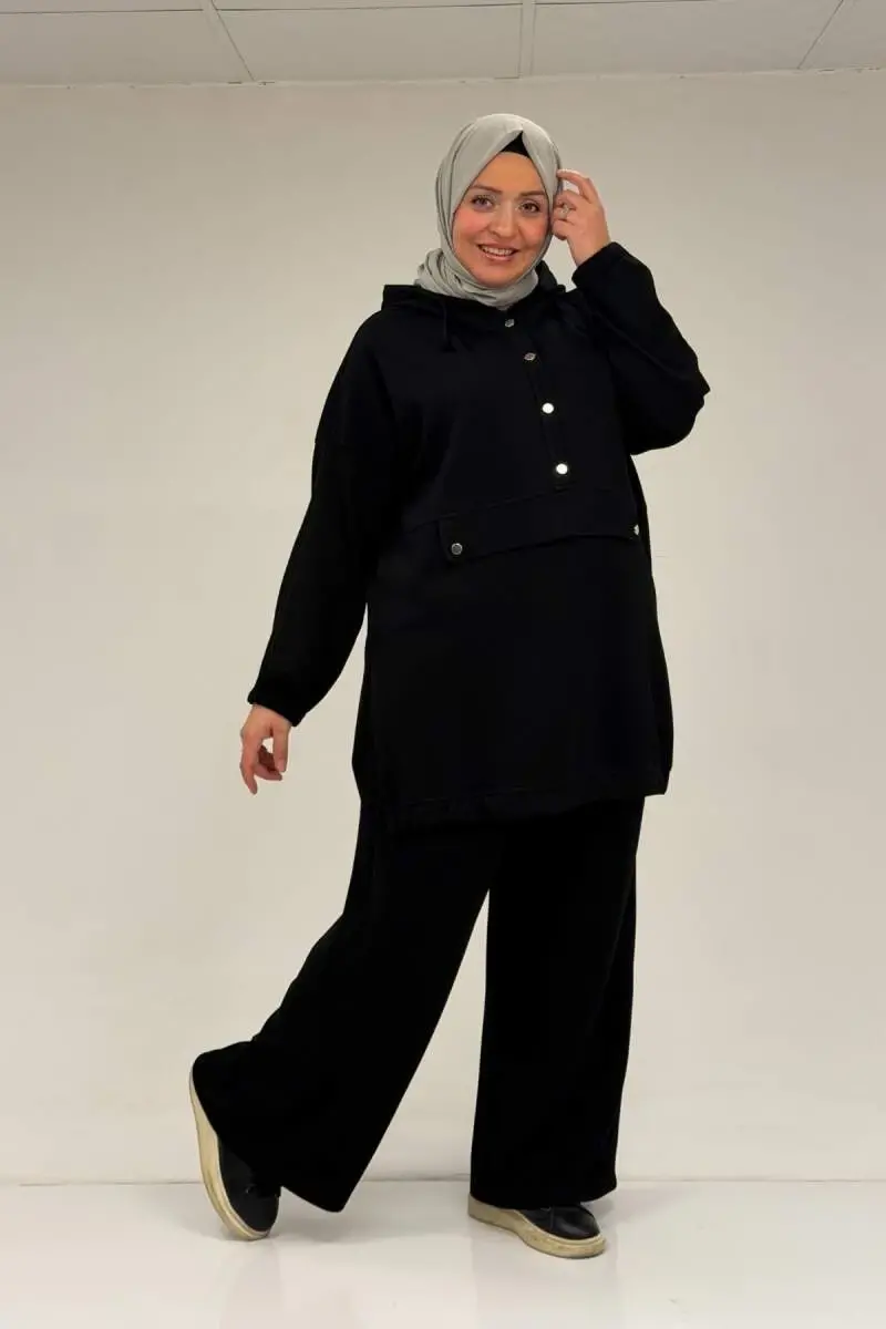 47089 Büyük Beden Yarım Patlı Kapşonlu Pantolonlu Modal Takım - Siyah