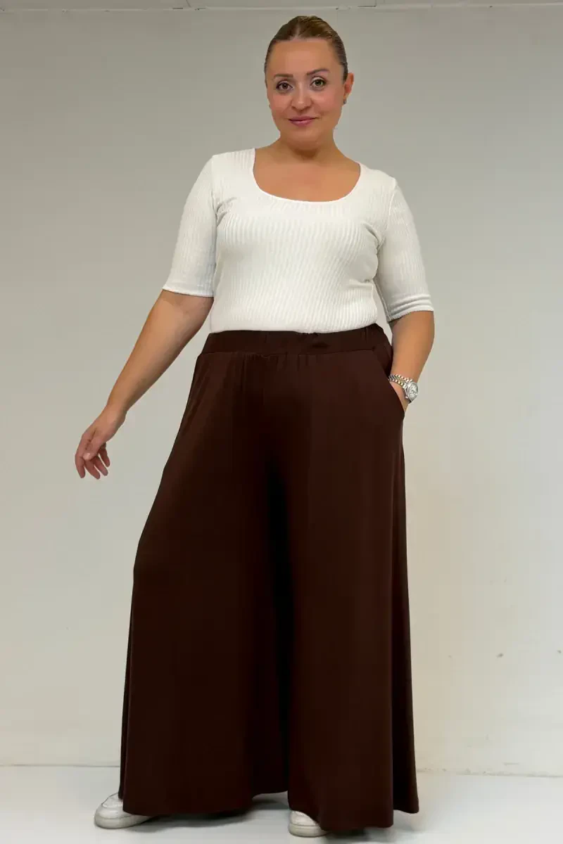 Познакомьтесь с юбкой-брюками 49003 большого размера с эластичной талией, которая станет незаменимой вещью в вашем гардеробе, сочетая в себе элегантность юбки и комфорт брюк! Этот особый дизайн кофейного цвета, который легко сочетается с любым вашим нарядом благодаря своей теплоте и вневременности, предлагает идеальный вариант для женщин больших размеров, ищущих комфорт и стиль. Почувствуйте комфорт в течение всего дня благодаря легкости ткани сэнди и мягкой текстуре вискозы. Смесь 92% вискозы и 8% лайкры придает юбке приятную драпировку и эластичность, не ограничивая при этом свободу движений. Благодаря эластичной талии ее легко надевать и снимать, и она создает ощущение, что ее нет на вас в течение всего дня. Дополните свой стиль на повседневных мероприятиях или на особых мероприятиях. Эта юбка-брюки, разработанная специально для весны и лета, отдает приоритет вашему комфорту благодаря своей не вызывающей потоотделения структуре даже в жаркую погоду. Сочетание землистых тонов кофейного цвета дает свободу сочетать ее с топами разных цветов и узоров. Вы можете посетить особое мероприятие в стильной блузке и туфлях на каблуках или создать непринужденный стиль с базовой футболкой и кроссовками для повседневного использования. Эта юбка-брюки не только заставит вас выглядеть стильно, но и позволит вам чувствовать себя хорошо. Этот дизайн, сочетающий в себе комфорт и стиль в одежде больших размеров, является кандидатом на то, чтобы стать одним из самых любимых предметов вашего гардероба. Крой, подходящий для любого типа фигуры, и эластичная талия позволяют вам комфортно двигаться в течение всего дня. Наслаждайтесь тем, что всегда выглядите стильно и комфортно, отдыхаете ли вы дома или встречаетесь с друзьями на улице. Юбка-брюки 49003 большого размера с эластичной талией — идеальный выбор для женщин больших размеров, которые хотят создать стильный и комфортный образ.