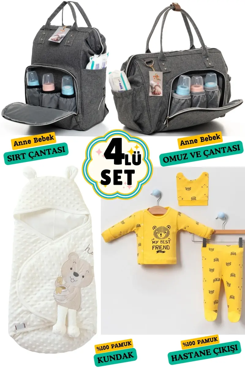 4-Piece Large Newborn Set (HOSPITAL OUTFIT, BABY CARE BACKPACK AND SHOULDER BAG, SWADDLE) - GRAYProduct DescriptionThe arrival of a new baby is one of the most special and unforgettable moments in a family's life. In this miraculous journey, it is possible to make this special moment even easier with a carefully selected and assembled set that meets the needs of both the expectant mother and the baby. Introducing the 4-Piece Large Newborn Set! This set includes everything you will need from the hospital discharge to your baby's first days and beyond. With its stylish design, quality materials and practical use, this set makes life easier for parents while prioritizing your baby's comfort and safety. This set includes soft hospital clothes suitable for your baby's delicate skin. In addition to being your baby's first clothes, they will also look great in photo shoots. In addition, the baby care backpack and shoulder bag, which draws attention with its large internal volume and useful compartments, allows you to carry all your belongings in an orderly manner. Thanks to the thermos compartment, you can keep your baby's food warm, and you can ensure hygiene with the wet wipe compartment. The swaddle helps your baby to be wrapped in the first months and feel safe as if he/she is in the womb. Carrying the nobility and modernity of gray, this set is suitable for both girls and boys. In addition to being an unforgettable gift option, it is also a starter set that you can choose with peace of mind for your own baby. Everything you need in your baby's first days comes together in this set. Now you can enjoy these special moments and have a peaceful and happy start with your baby. Celebrate your baby's arrival into the world with the 4-Piece Large Newborn Set and take the first step on the most beautiful journey of your life! This set is not just a product, but also a memory. As your baby grows, each piece in this set will remind you of those first days, creating a sweet smile on your face. Since it is produced from quality materials, you can keep it for many years, and even use it for your child's own baby in the future. The 4-Piece Large Newborn Set is an investment not only for your baby but also for you. With this set, you can make your parenting journey more enjoyable and stress-free, and make the most of your baby's first moments. Remember, every parent deserves the best, and your baby deserves the best. That's why the 4-Piece Large Newborn Set will be an ideal choice for you.Product Features* The hospital exit outfit is made of 100% cotton fabric suitable for your baby's delicate skin.* The baby care backpack keeps your belongings organized with its large internal volume and numerous compartments.* Thanks to the shoulder strap, you can easily carry the bag and free your hands.* The swaddle ensures that your baby feels comfortable and safe, and improves the quality of sleep.* All products in the set do not contain any substances harmful to your baby's health.* The thermos compartment of the bag keeps your baby's food or drink at the ideal temperature.* Hygiene is always at your fingertips thanks to the wet wipe compartment.* It appeals to both mothers and fathers with its stylish and modern design.* The gray color option is suitable for both girls and boys.* The hospital exit outfit has a snap design for easy wearing and removal.* The swaddle provides a comfortable sleeping environment without restricting your baby's movements.* The waterproof fabric of the baby care bag keeps your belongings safe.* Thanks to the hanging apparatus on the bag, it can be easily attached to the stroller.* The set is a meaningful and useful gift option that you can give to your relatives who have just given birth.* All products are made of long-lasting and durable materials.Additional InformationContents of our product: Hospital exit romper, hat, gloves, booties, baby care backpack and shoulder bag, swaddle. Cleaning of our product: Hospital exit clothes and swaddle can be washed at 30 degrees. The baby care bag can be cleaned by wiping with a damp cloth. Please read the labels and follow the instructions before using the products. Our products are manufactured in Turkey and have high quality standards.