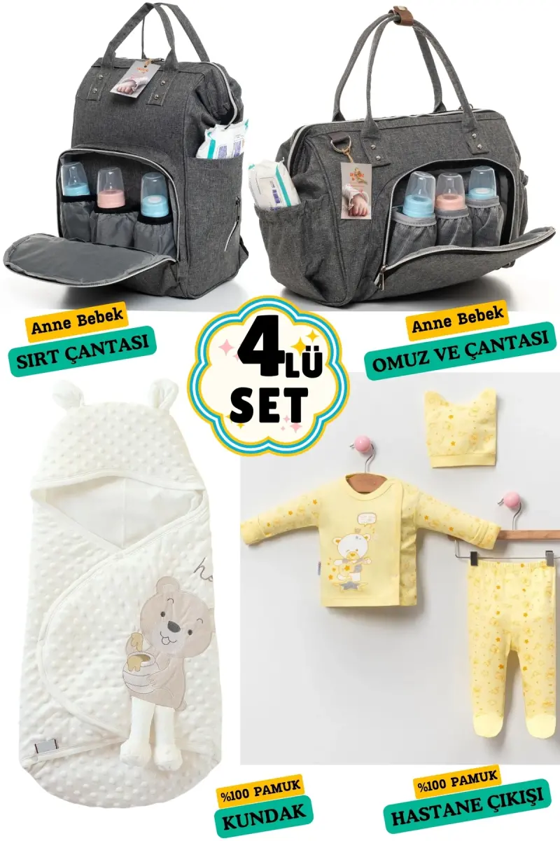 The 4-Piece Big Newborn Set is a comprehensive set carefully prepared to meet the needs of your newborn baby and yourself. This set includes essential products that your baby will need from the hospital discharge onwards, as well as practical and stylish baby care bags that will make mothers' lives easier. The hospital discharge set included in the set is made of 100% cotton fabric that does not harm your baby's sensitive skin. Thanks to its soft texture, it ensures your baby's comfort. The Elegance Baby Care Shoulder and Hand Bag offers elegance and functionality together. It adapts to any environment thanks to its different carrying options. You can safely store your baby's bottles thanks to its thermal compartment. The Mother&Baby Care Backpack helps you carry all your belongings in an organized manner with its large interior volume and useful compartments. It is not affected by weather conditions thanks to its waterproof feature. The Bear Chickpea Swaddle keeps your baby warm and safe. Thanks to its antiallergic fabric and soft filling, it does not irritate your baby's skin. This set is designed considering both your baby's comfort and your convenience. This set, where you can find everything your baby needs from the first days, will also appeal to you with its stylish and useful design. This set, which will accompany you on travels as well as in daily use, is an indispensable helper that will make your motherhood easier. Our product is sent by Sahra Bebek and is offered at a campaign price. A maximum of 10 units of a product can be ordered, orders exceeding this limit may be canceled by Trendyol. The specified limit is not valid for corporate orders. There is a free return option within 15 days of the product. You can visit the return conditions page for detailed information.
