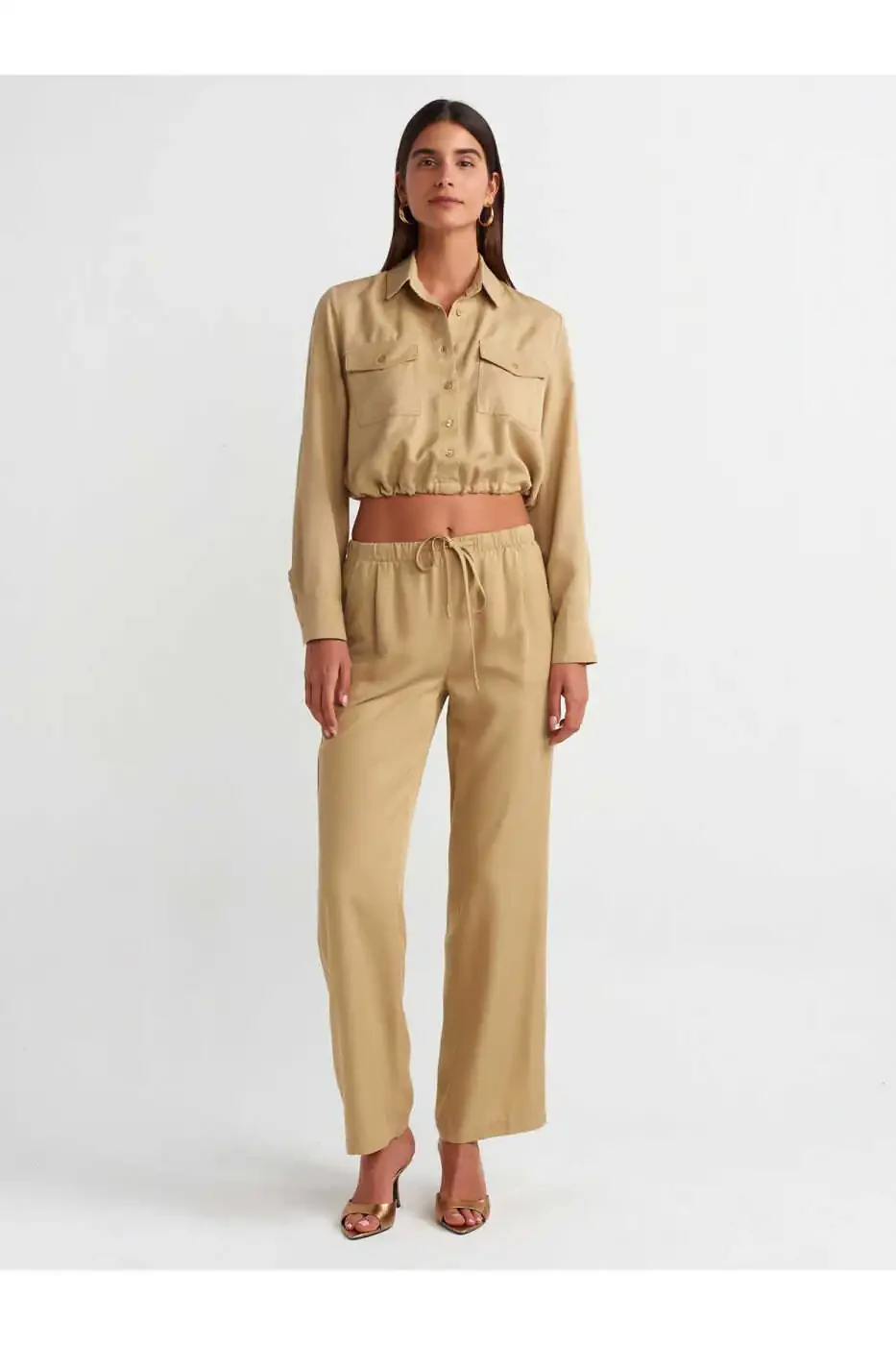 cargo pocket blouse, camel blouse, 50488, women's blouse, comfortable blouse, stylish blouse, casual wear, outfit ideas, cargo pants, leggings, skirt, sneakers, heels