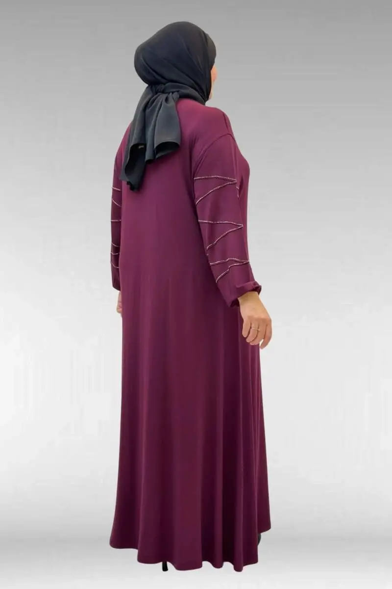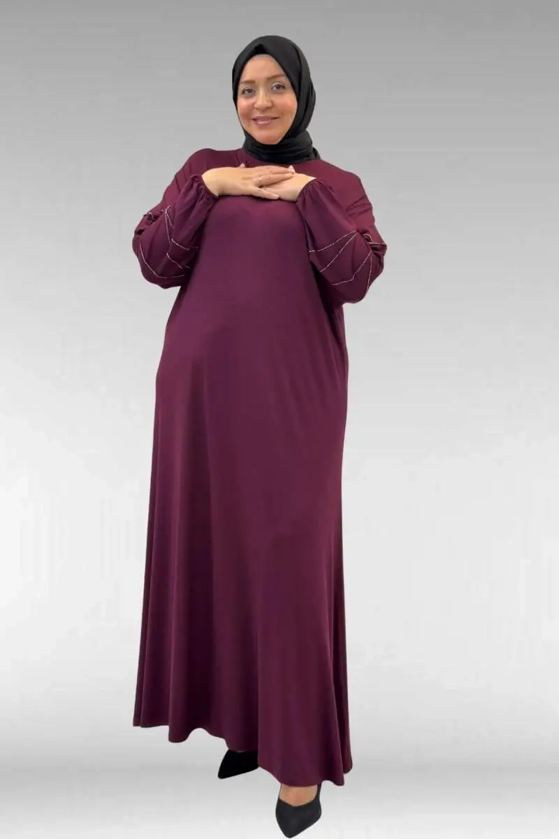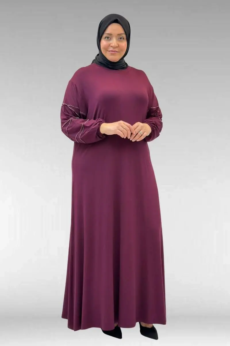 52021 Büyük Beden Çimalı Taş Detaylı Penye Elbise - Bordo