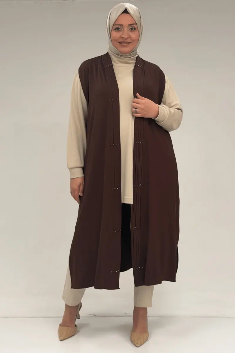 54005 Büyük Beden Patı Pileli Giy Çık Yelek - Kahve