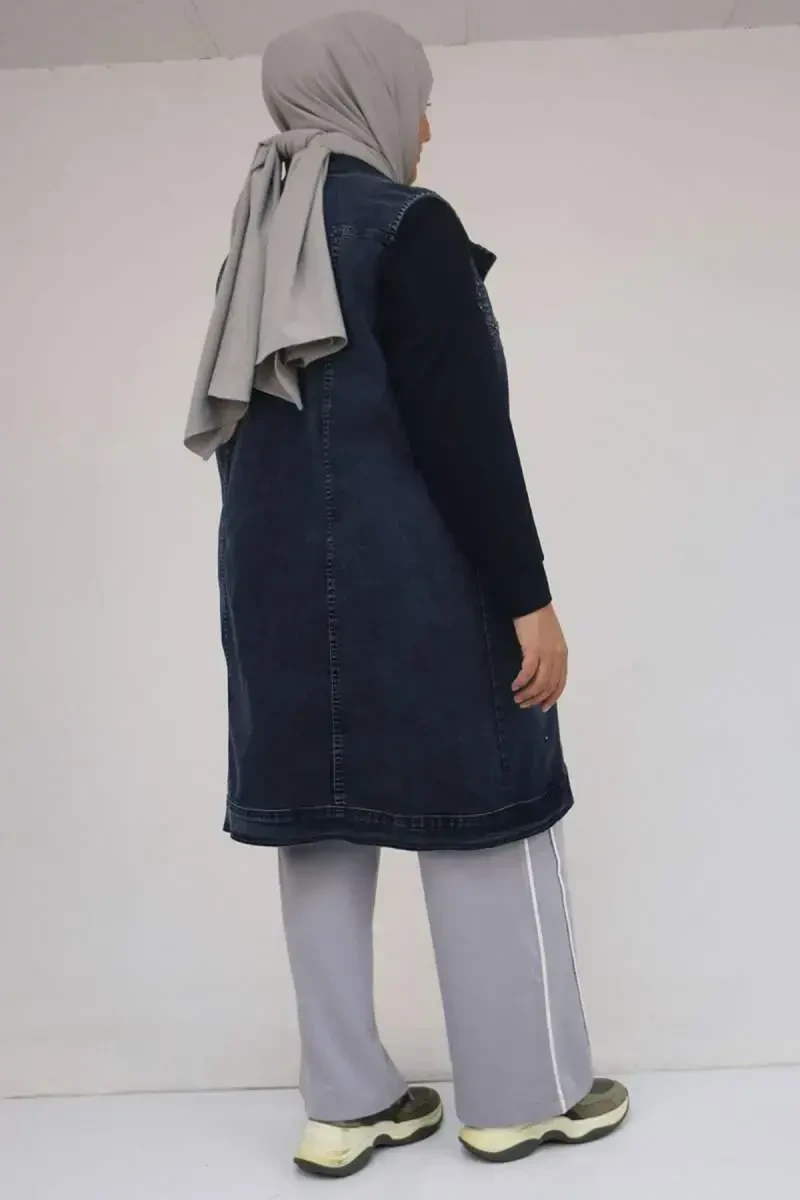 Большой размер, джинсовая жилетка с жемчугом - темно-синяя жилетка с двумя карманами