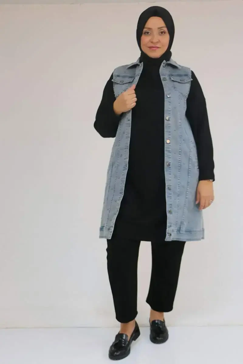 Bring your style to a whole new dimension with the 54007 Plus Size Double Pocket Pearl Embellished Denim Vest, which combines elegance and comfort in plus size clothing! This vest, which attracts attention with its snow wash smoke color, highlights elegance with its pearl details and offers a useful experience with its double pocket detail. This special design vest, which you can easily adapt to any combination, is an ideal choice for both daily use and special moments.Product Description54007 Plus Size Double Pocket Pearl Embellished Denim Vest is specially designed for women who want to be stylish in plus size clothing. The snow wash smoke color gives the vest a modern and cool look, while the pearl studs represent elegance and style. This vest, which offers long-lasting use thanks to its high-quality denim fabric, also prioritizes comfort. The double pocket detail creates a stylish look and allows you to carry your small items safely. Whether you combine it with t-shirts or blouses, this vest will always complement your style and give you confidence. Thanks to its plus size cut, this vest, which perfectly wraps your body lines, allows you to be comfortable all day long. This stylish and useful denim vest, which will be an indispensable part of your wardrobe, also attracts attention with its ability to be worn in every season. This vest, which you can easily use in any environment from special occasions to daily activities, is the best way to reflect your style. Pearl details add a sophisticated touch to the vest, while the snow wash smoke color provides a modern and trendy look. The 54007 Plus Size Double Pocket Pearl Embellished Denim Vest, which is an ideal choice for women who are looking for elegance and comfort in plus size clothing, is a candidate to be one of the most loved pieces of your wardrobe. Don't miss this special design vest that will both reflect your style and provide you with comfort all day long. Push the boundaries while creating your own style and always be stylish and confident with the 54007 Plus Size Double Pocket Pearl Embellished Denim Vest.Product Features* Plus size cut* Double pocket detail* Pearl studded design* Snow wash smoke color* High quality denim fabric* Comfortable and stylish look* Ability to adapt to any combination* Long-lasting use* Suitable for daily and special occasions* Cut that perfectly wraps body linesAdditional InformationIt is recommended to follow the washing instructions to ensure the product lasts longer. It should be washed at low temperature and with similar colors. Bleach should not be used. It is recommended to wash the product inside out to prevent damage to the pearl details. The size on the model is 44. Our products are manufactured in Turkey.