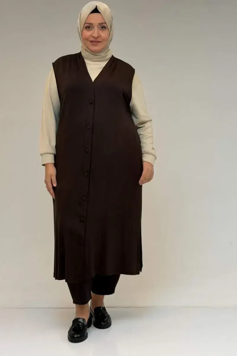 Gardırobunuzun vazgeçilmezi olacak 54017 Büyük Beden Kaplama Düğmeli Giy-Çık Penye Yelek ile tanışın! Kahve renginin sıcaklığı ve şıklığıyla her kombininize kolayca uyum sağlayacak bu yelek, özellikle ilkbahar ve yaz aylarında konforlu ve stil sahibi bir görünüm elde etmek isteyenler için ideal bir seçimdir. Büyük beden kesimi sayesinde rahat bir kullanım sunarken, kaplama düğme detayları ise yeleğe zarif bir dokunuş katmaktadır. Giy-çık kolaylığı sayesinde pratik bir kullanım sunan bu penye yelek, günün her anında size eşlik etmeye hazır. İster günlük kombinlerinizde, ister daha özel anlarınızda şıklığınızı tamamlayacak olan bu yelek, konforu ve zarafeti bir arada sunuyor. Turlu viskon kumaşın yumuşak dokusu teninize hoş bir his verirken, likra içeriği sayesinde hareket özgürlüğünüzü kısıtlamaz. Bu sayede gün boyu rahat ve özgür hissedebilirsiniz. Kahve renginin toprak tonlarıyla uyumu, farklı renk ve desenlerdeki kıyafetlerinizle kolayca kombin yapmanızı sağlar. Jean pantolonlarla spor bir şıklık yakalayabilir, etek ve bluzlarla daha zarif bir görünüm elde edebilirsiniz. Aksesuar seçimlerinizle de yeleğinizi kişiselleştirebilir, kendi tarzınızı yansıtabilirsiniz. 54017 Büyük Beden Kaplama Düğmeli Giy-Çık Penye Yelek, sadece şık bir görünüm sunmakla kalmaz, aynı zamanda kullanım kolaylığı ve konforu da ön planda tutar. Dolabınızın en sevilen parçalarından biri olmaya aday olan bu yelek, her mevsim size eşlik edecek zamansız bir tasarıma sahiptir. Büyük beden giyimde şıklığı ve rahatlığı bir arada arayan kadınlar için mükemmel bir seçenektir. Kahve renginin sıcaklığı ve penye kumaşın konforuyla her zaman şık ve rahat hissetmenizi sağlar. Bu yeleği gardırobunuza ekleyerek, her kombininize kolayca şıklık katabilirsiniz. Unutmayın, stil sadece kıyafetlerle değil, aynı zamanda rahatlıkla da ilgilidir. Bu yelek, size her ikisini de sunuyor.