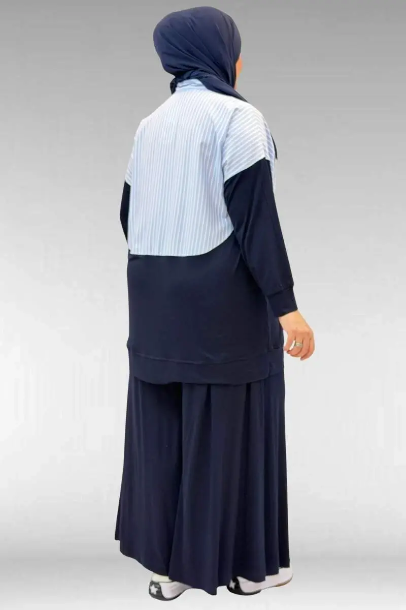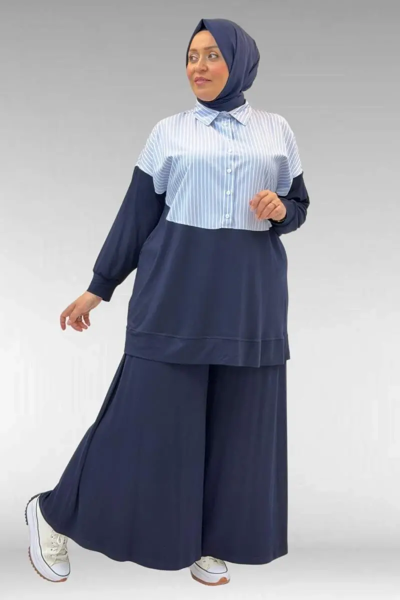 57016 Büyük Beden Erkek Yaka Kombinli Pantolonlu Takım - Lacivert-Mavi