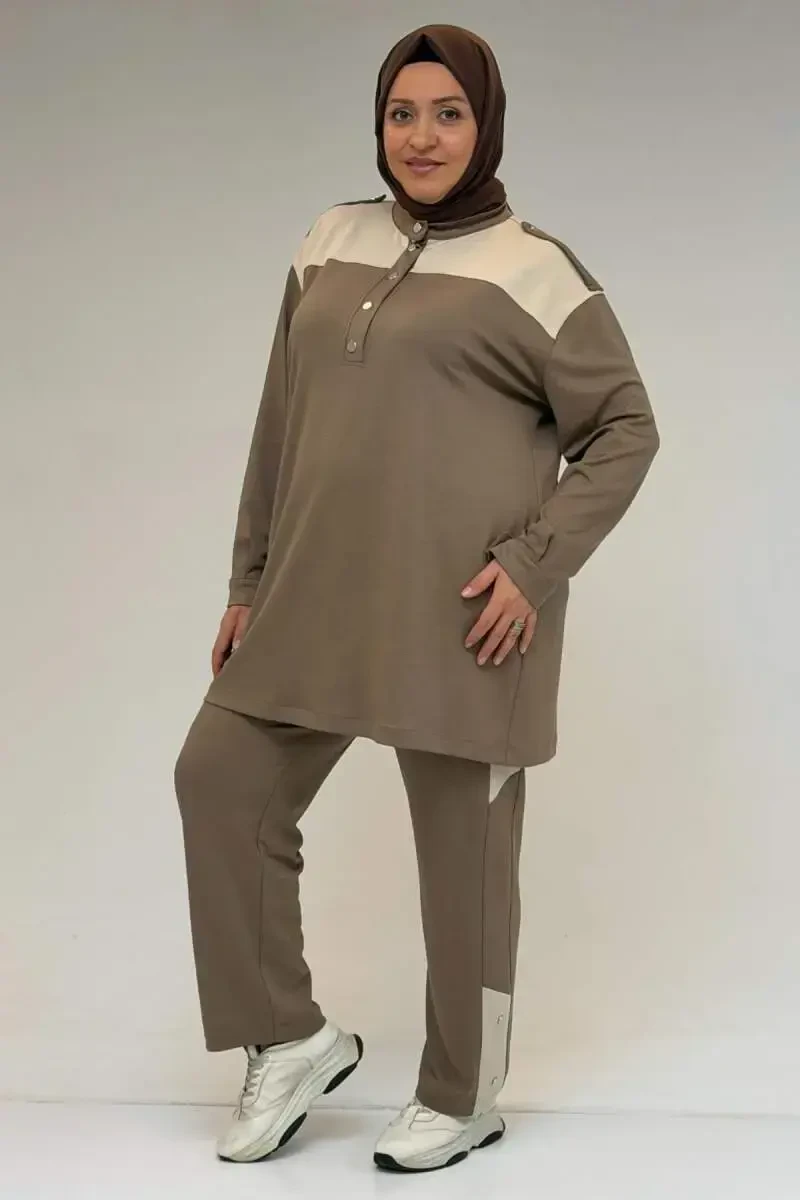 57042 Büyük Beden Yarım Patlı Çıtçıtlı Modal Pantolonlu Takım - Vizon