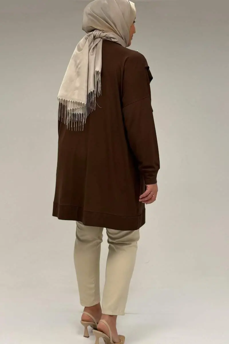 58074 Büyük Beden Fırfır Ve Taş Detaylı Penye Tunik - Kahve
