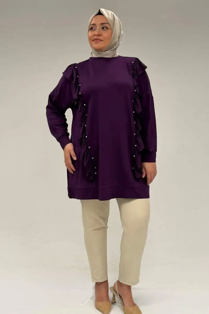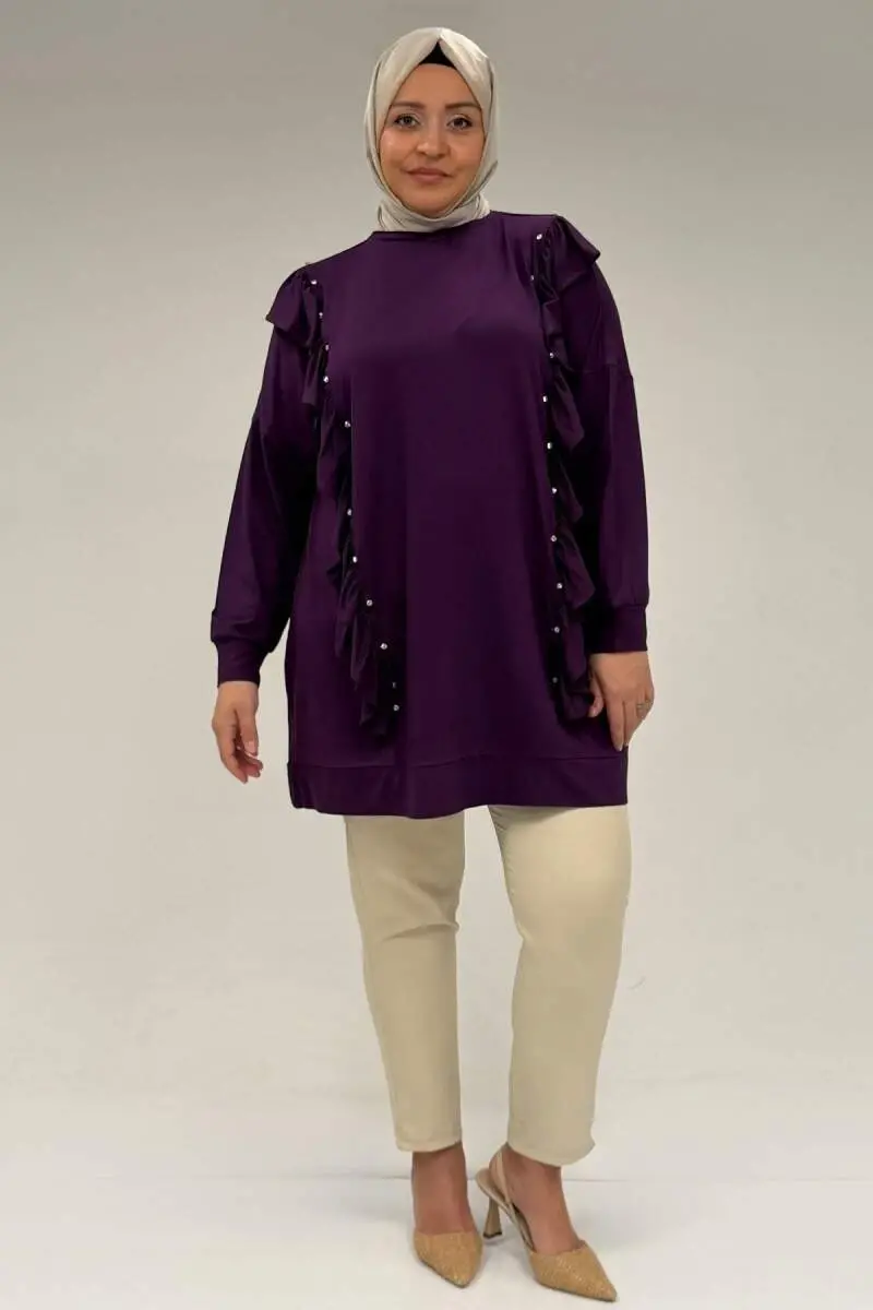 58074 Büyük Beden Fırfır Ve Taş Detaylı Penye Tunik - Mürdüm
