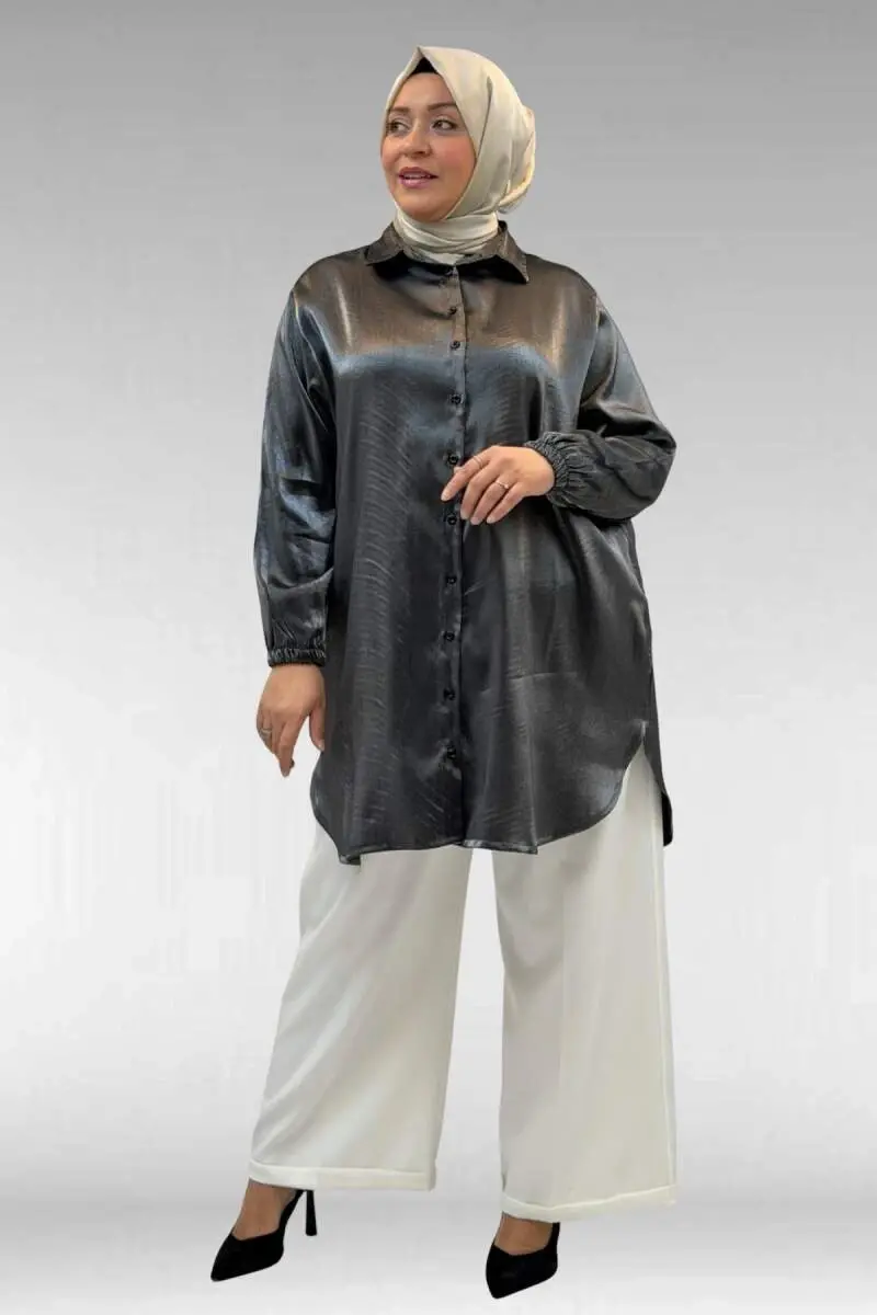 58085-1 Büyük Beden Kolları Lastikli Star Gömlek - Siyah