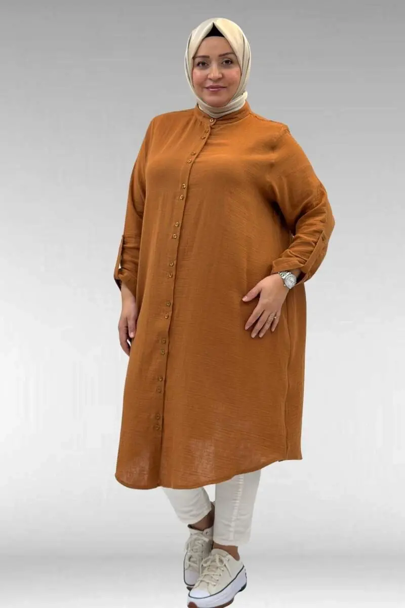 58092 Büyük Beden Çift Düğme Detaylı Müslin Gömlek - Tarçın