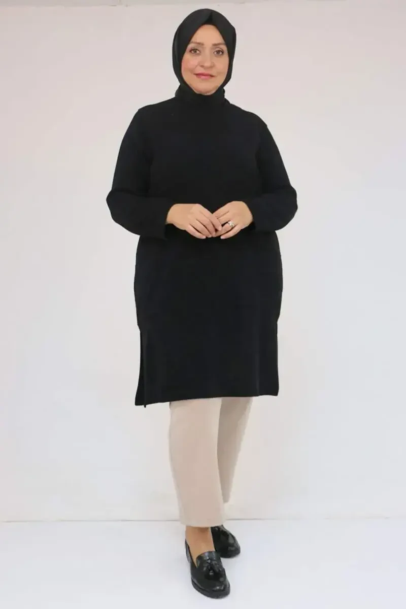 Experience comfort without sacrificing elegance in the fall and winter months with the 58103 Plus Size Biyeli Mir Tunic - Black. This special design tunic combines the comfort and modern look you are looking for in plus size clothing. The unique texture of Mir fabric leaves a pleasant feeling on you all day long, while its lycra content does not restrict your freedom of movement. The noble and timeless color of black will easily adapt to any combination and become an indispensable part of your wardrobe. The piping details on the tunic add an elegant touch to the design, while the cut reveals your body lines in the most beautiful way. This tunic, which you can easily prefer in both daily use and special occasions, offers elegance and comfort together. Its fabric structure that will keep you warm in cold weather also prevents sweating thanks to its breathable feature. The 58103 Plus Size Piping Detail Mir Tunic is produced with quality materials and careful workmanship. Designed for long-lasting use, it will maintain its original appearance if washing instructions are followed. With the advantage of black color, it can be easily combined with accessories in different colors and patterns. You can create different styles by completing it with boots in winter and sneakers in autumn. This tunic not only makes you look stylish but also makes you feel good. The softness of viscose and the flexibility of lycra allow you to move comfortably all day long. This tunic, which puts an end to the fit problems frequently encountered in plus size clothing, fits your body perfectly and creates a perfect silhouette. Attract attention in any environment with this tunic that you can easily combine with other pieces in your wardrobe and offers timeless elegance. Please note that there may be slight differences in color tones due to concept shots. Model measurements (waist width: 88 cm, chest width: 103 cm, hip: 116 cm, height: 170 cm) will give you an idea of how the tunic will look on you. You can get a more stylish look when combined with high heels (heel height: 175 cm). Experience elegance and comfort together with the 58103 Plus Size Piping Detail Mir Tunic - Black!