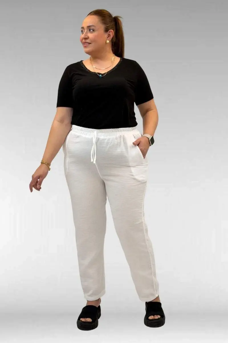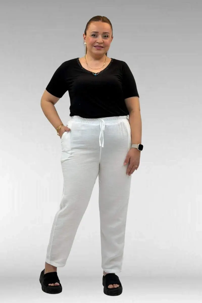 59020 Büyük Beden Beli Lastikli Müslin Dar Paça Pantolon - Ekru