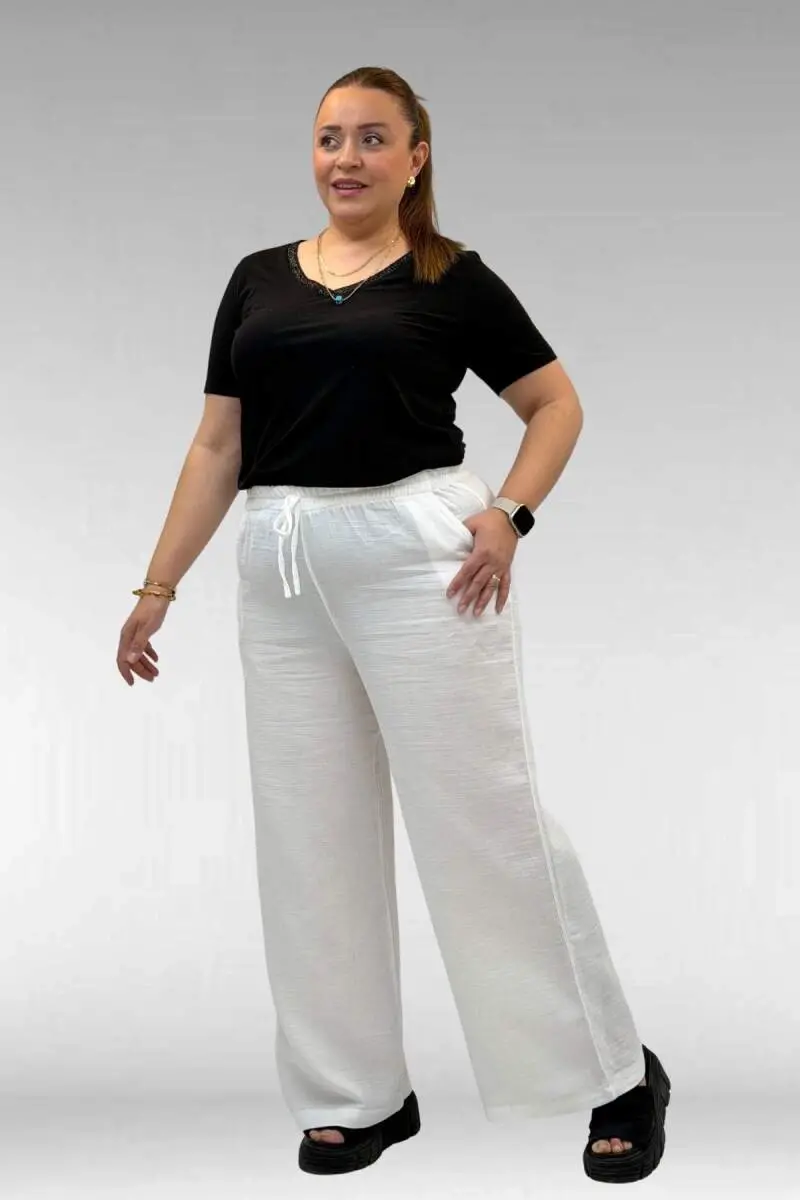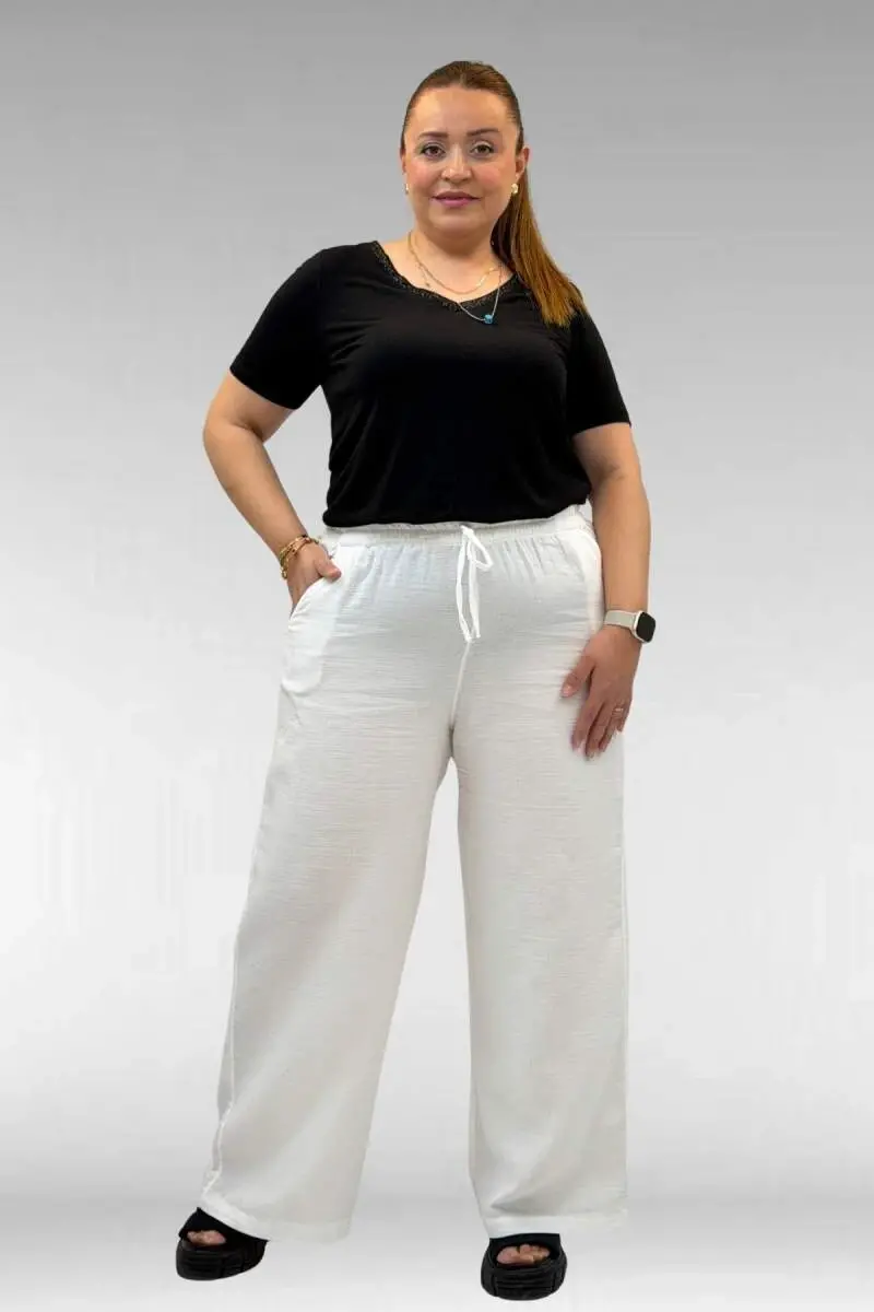 59021 Büyük Beden Beli Lastikli Müslin Bol Paça Pantolon - Ekru