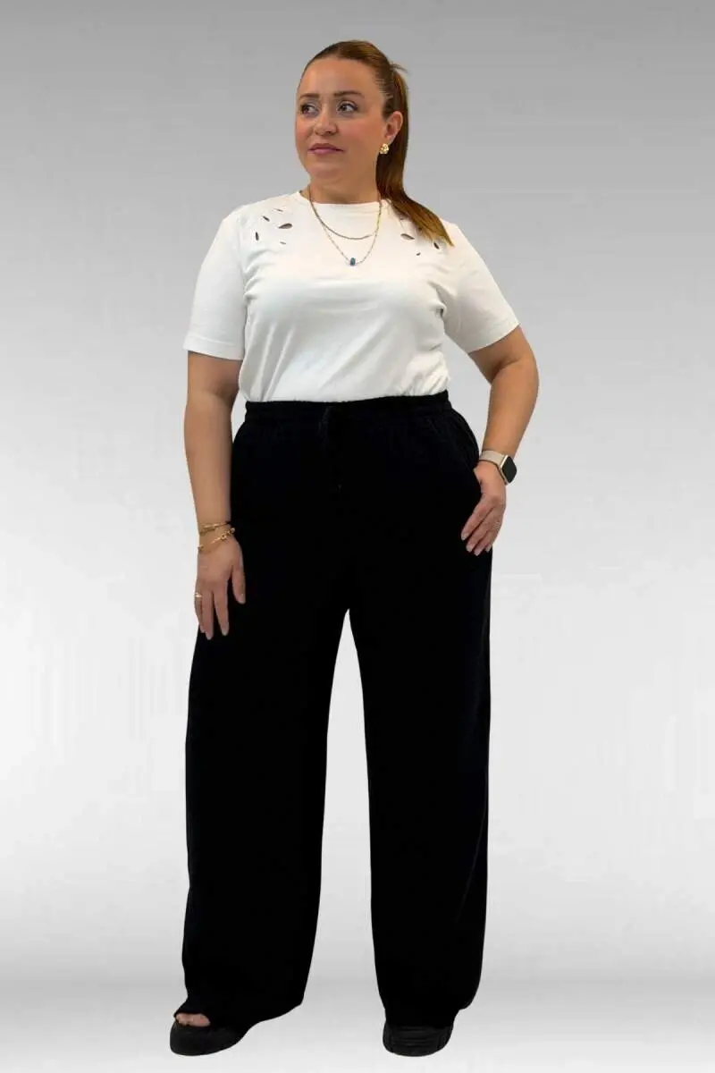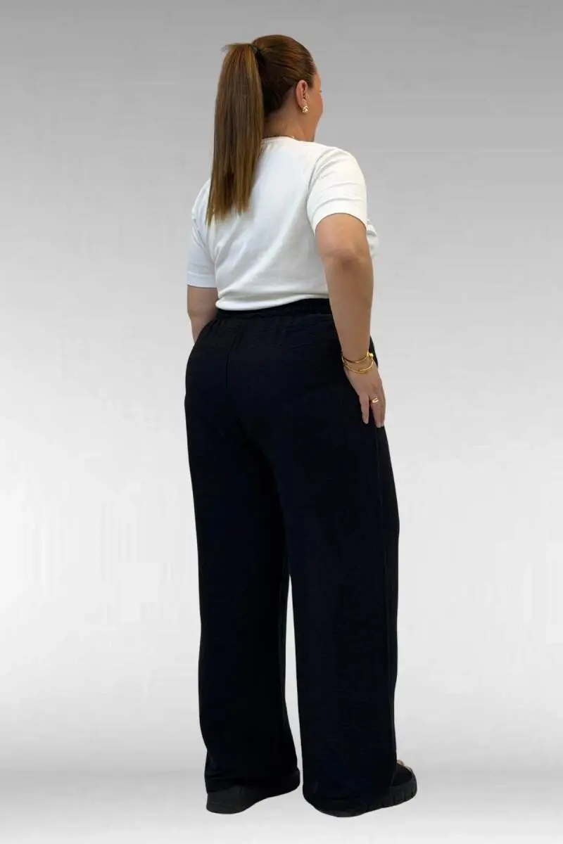 59021 Büyük Beden Beli Lastikli Müslin Bol Paça Pantolon - Siyah