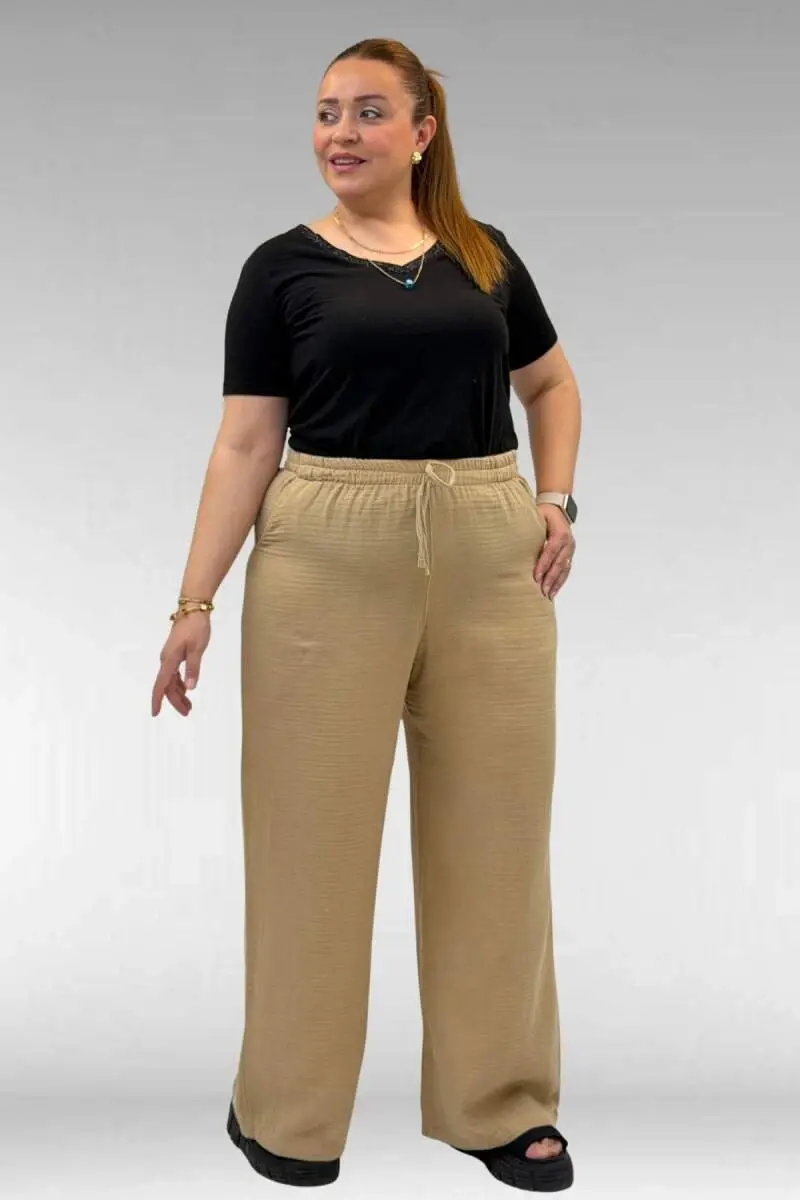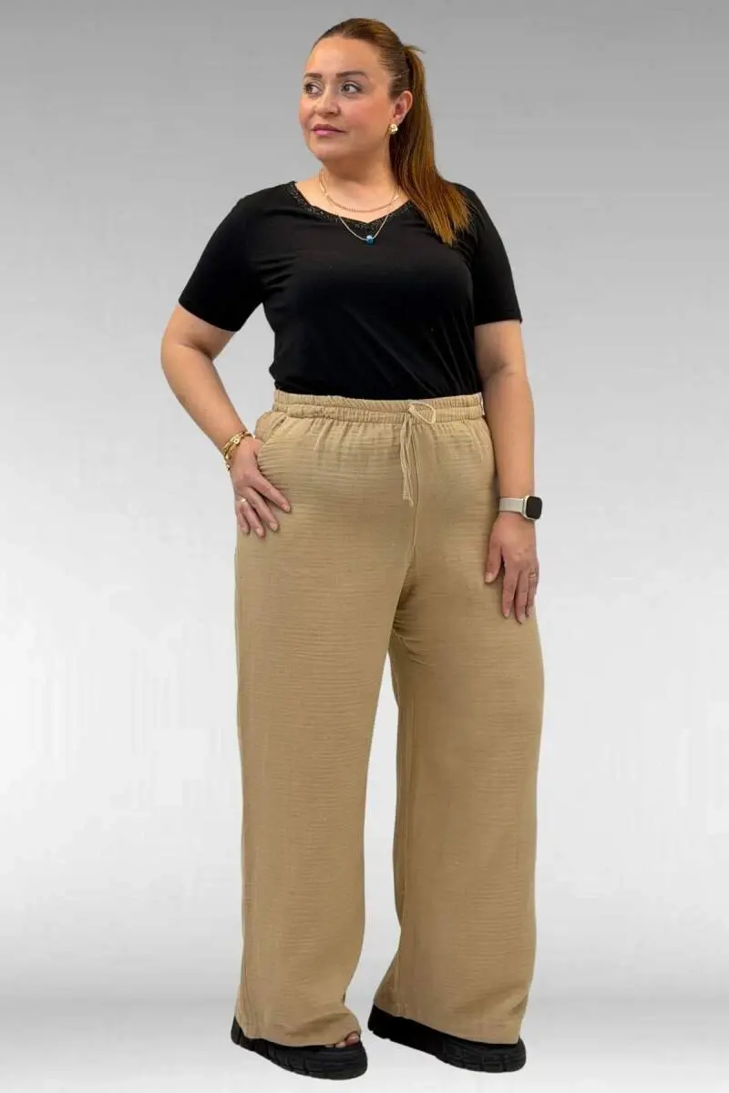 59021 Büyük Beden Beli Lastikli Müslin Bol Paça Pantolon - Vizon