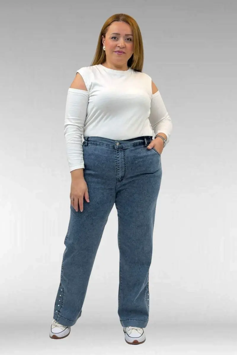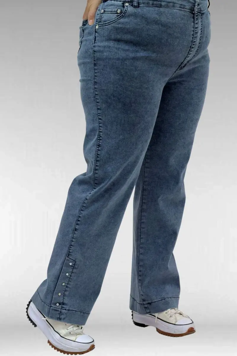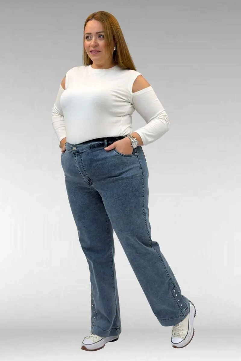 59024 Büyük Beden Paçasında Taş Detaylı Kot Pantolon - Petrol