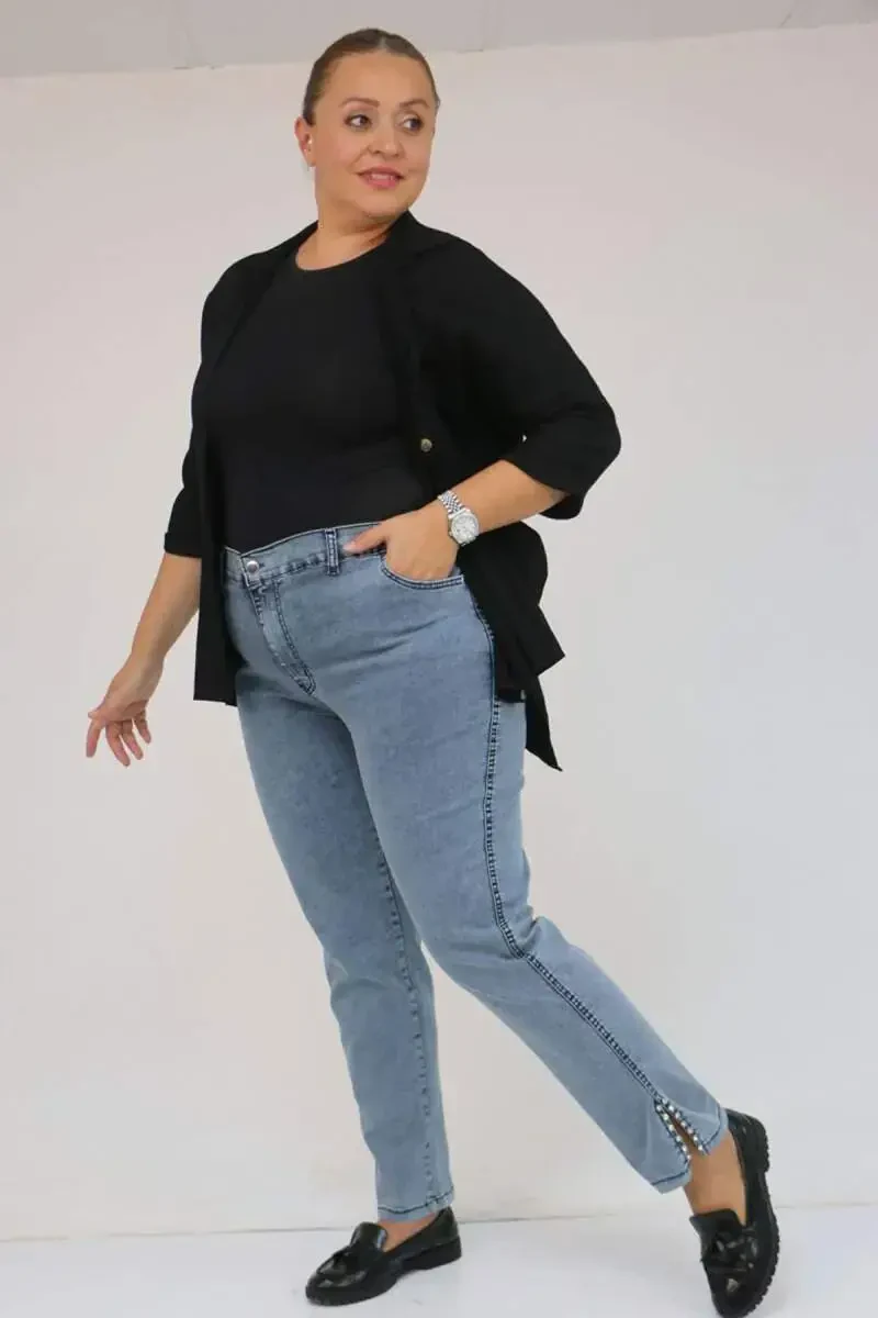 59031 Plus Size Slit Hem Jeans with Stone Detail on Slit - Cold Blue