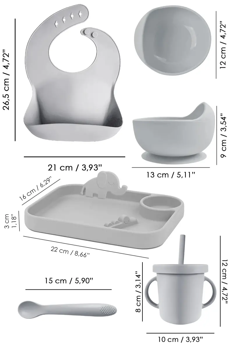 5 qismli silikon ovqatlantirish to'plami - Chaqaloq uchun so'lakcha - Tarelka - Vakuumli kosa - Pipetli stakan - Qoshiq - Kulrang