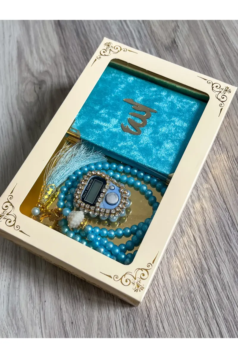 6 Adet Hediyelik Çeyizlik Kutulu Yasin Cüzü Tesbih Ve Taşlı Zikirmatik Setimiz-Turkuaz