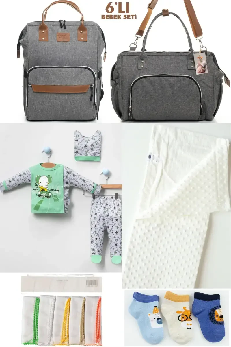 6’li Bebek Doğum Seti (Hastane Çıkış, Anne&Bebek Bakım Omuz ve Sırt Çantası, Battaniye, Çorap ve Mendil) - Gri