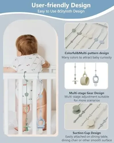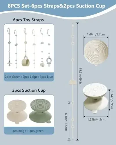 Are you looking for a way to keep your baby's toys, pacifiers, and other accessories safe and clean? The 6-Piece Silicone Baby Toy Straps and 2-Piece Suction Base Set is a must-have for parents. This versatile set includes 6 silicone straps in 3 different colors and 2 suction bases in 2 different colors. Designed with cute patterns like sun, moon, star, rainbow, snowflake, and clouds, these straps have vibrant and bright colors that support your baby's visual, motor, and sensory development. You can easily attach your baby's pacifier, rattle, bottle, or other toys to these straps to prevent them from falling and getting dirty. Thanks to the suction bases, you can fix spoons and forks to the high chair or flat surfaces, making it easier for your baby to eat on their own and preventing spills. Made of durable and safe silicone material, these straps provide peace of mind for your baby's health.