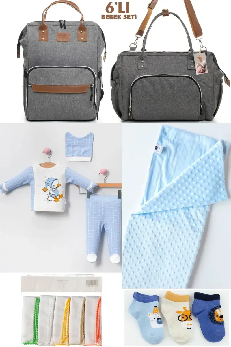 Sahra Bebek's meticulously prepared 6-Piece Baby Newborn Set is designed to meet the needs of your little baby and valued mothers at the highest level. This special set accompanies you in a wide range, from hospital discharge to daily use. This set, which prioritizes elegance, functionality, and your baby's health, will be indispensable during your pregnancy and infancy periods. Each product in the set is made of organic materials suitable for your baby's sensitive skin. Every detail, from blankets to socks, handkerchiefs to mother-baby care bags, has been carefully selected and brought together. This set, produced with materials sensitive to the health of mother and baby, is an option you can use with peace of mind. Thanks to its eye-catching printed pattern, this set offers both a stylish and fun look, and will be an unforgettable detail in your photos from your baby's first moments. Offering not only aesthetic but also practical use, the shoulder and backpack allows you to carry all your baby's belongings in an organized manner. Thanks to its internal compartments, you can easily place your bottles, diapers, wipes and other materials and reach them quickly when you need them. This set provides great convenience not only for newborn babies, but also for mothers. Thanks to its design suitable for daily use, you can keep all your needs with you when you go out with your baby. This set, which cares for your baby's health with its organic structure, also contributes to the principle of sustainability. This 6-Piece Baby Newborn Set, offered with Sahra Bebek quality, will accompany you from the first days your baby is born and will be a partner in your unforgettable memories. You can evaluate this set as a meaningful gift option for both yourself and your loved ones.