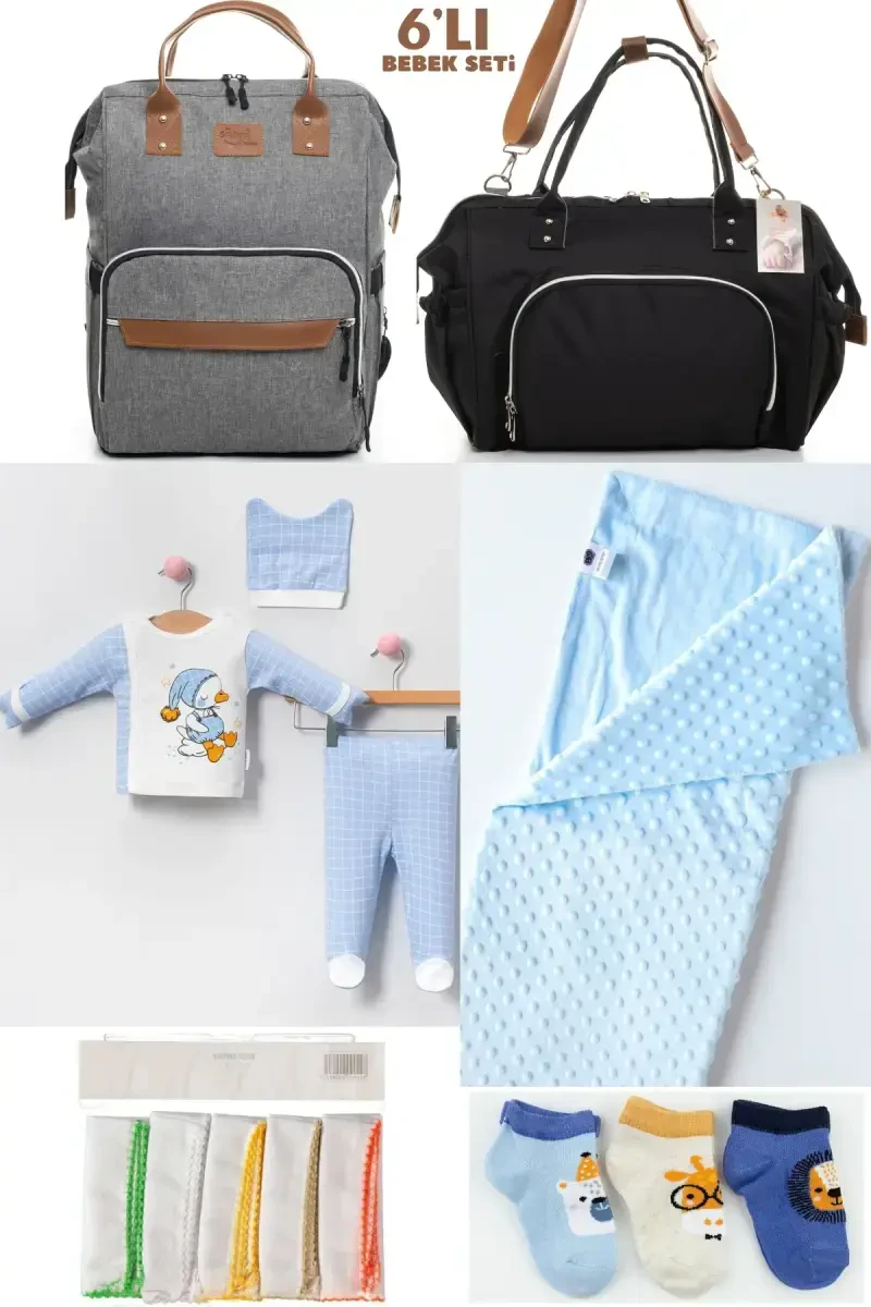 6-Piece Baby Newborn Set (Hospital Outfit, Mother & Baby Care Shoulder and Backpack, Blanket, Socks and Handkerchief) - GrayThe excitement of having a baby is indescribable! Meet the 6-Piece Baby Newborn Set, designed to make these special moments easier and to fully meet your baby's needs. This set, which offers everything your baby will need from the hospital exit, makes life easier for mothers while prioritizing the comfort of babies. Designed with the noble and modern stance of gray color, this set offers both a useful and stylish option.**Product Description**The 6-Piece Baby Newborn Set, carefully prepared to meet the needs of a newborn baby and its mother, includes the basic products that you can use from the hospital exit. One of the most important parts of the set, the hospital exit set, includes your baby's first clothes. These clothes, produced from 100% cotton fabric that does not harm your baby's skin with its soft texture, protect your baby's sensitive skin. The mother & baby care shoulder and backpack included in the set allow you to carry all your baby's belongings in an orderly manner. Thanks to its large interior volume, different compartments and useful design, you can easily place everything from baby bottles to wet wipes, from spare clothes to toys. Being able to be used as a backpack offers you freedom of movement. The blanket, which will keep your baby warm during sleep hours, is suitable for use both at home and outdoors with its soft texture and ideal size. Socks that will keep your baby's tiny feet warm do not restrict your baby's movements with their flexible structure. The handkerchief, specially produced for sensitive skin, helps you gently clean your baby's face and body. Designed with the soothing and stylish effect of gray color, this set offers everything you need in your baby's first days, saving you time and making your life easier. This set is not just a product, but also a symbol of the first bond you establish with your baby. These products, carefully selected for his/her health and happiness, will give you peace and confidence. The 6-Piece Baby Newborn Set is an ideal choice to offer your baby the best in his/her first days and to enjoy these special moments. Designed with your baby's comfort and your comfort in mind, this set offers long-lasting use. It is made of high quality materials and is resistant to repeated washing. All of the products do not contain any substances harmful to baby health. This set, which you can use with peace of mind, will be an indispensable part of your baby's first wardrobe.**Product Features*** The hospital exit set is made of 100% cotton fabric.* The mother & baby care bag keeps your belongings organized with its large interior volume and useful compartments.* The blanket does not irritate your baby's skin with its soft texture.* Socks do not restrict your baby's movements with their flexible structure.* The handkerchief is specially produced for sensitive skin and does not contain alcohol.* All products in the set do not contain any substances harmful to baby health.* The mother & baby care bag can be used as both a shoulder bag and a backpack.* The blanket has ideal dimensions and is suitable for use at home and outdoors.* The hospital exit set includes your baby's first clothes.* All of the products are resistant to repeated washing.* Gray color is suitable for both girls and boys.* The set is ready for use from your baby's birth.* The bag is made of waterproof fabric.* The bag has a bottle compartment inside.* The straps of the bag are adjustable.**Additional Information**All of the products in the set have been carefully selected and tested. Detailed information about the use and cleaning of the products is included on the product packaging. If you have any questions about the products, you can contact our customer service. The set can also be preferred as a gift. You can make your loved ones who have just become mothers happy with its stylish packaging and useful content. The content of the set may vary according to the seasons. Please check the current product descriptions.