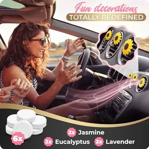 6 Pieces Sunflower Air Vent Clip Car Air Freshener Sunflower Car Accessories Cute Car Air Freshener Sunflowers Gift Decorations Girasoles Car Clip Interior Air Vent Decorations Package Includes: You will get 6 pieces sunflower car air vent clips in the package, which are designed with sunflower appearance, exquisite and cute, can not only decorate your car, but also bring you a pleasant mood Safe to Use: the sunflower car decorations are made of quality materials, safe and reliable, strong and sturdy, not easy to break or deform, which can be applied for a long time; The surface of the clip is smooth, so it will not scratch your car vent Easy to Operate: you just need to open the package, and then clip the sunflower air freshener on your car vent, which is easy to install and remove, saving your time and effort; And you can choose the location to install according to your preference, which is very convenient and fast Exquisite Decoration: the sunflower car air vent clips can not only release your favorite essential oil to purify the air in the car, but also decorate your car, making your car more attractive and interesting; When you feel tired or stressed while driving, they can bring you a relaxed and happy feeling Wide Applications: the sunflower car accessories are suitable for most car vents, so you don't have to worry about incompatibility; You can also clip them on anywhere you want, such as air conditioner, office, home, etc.