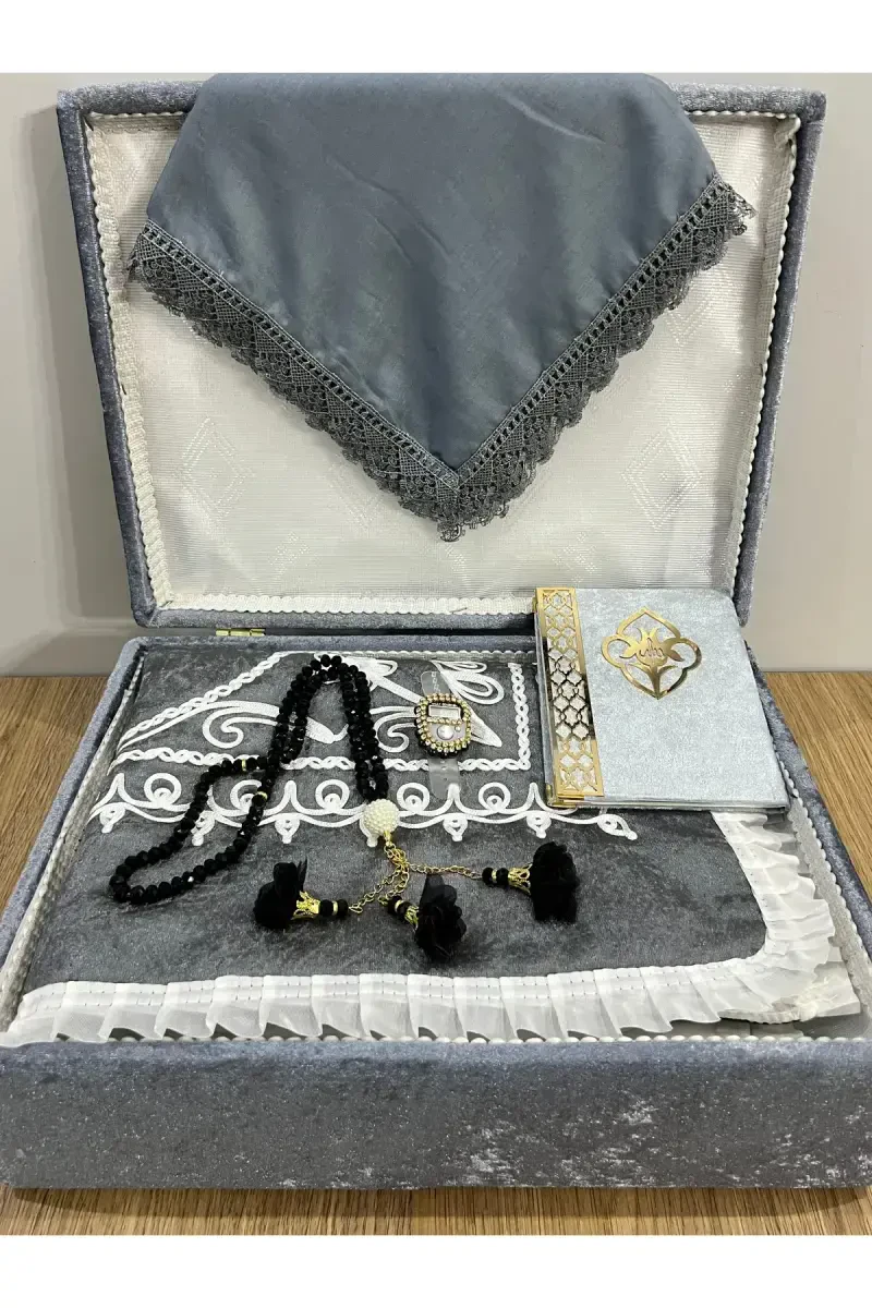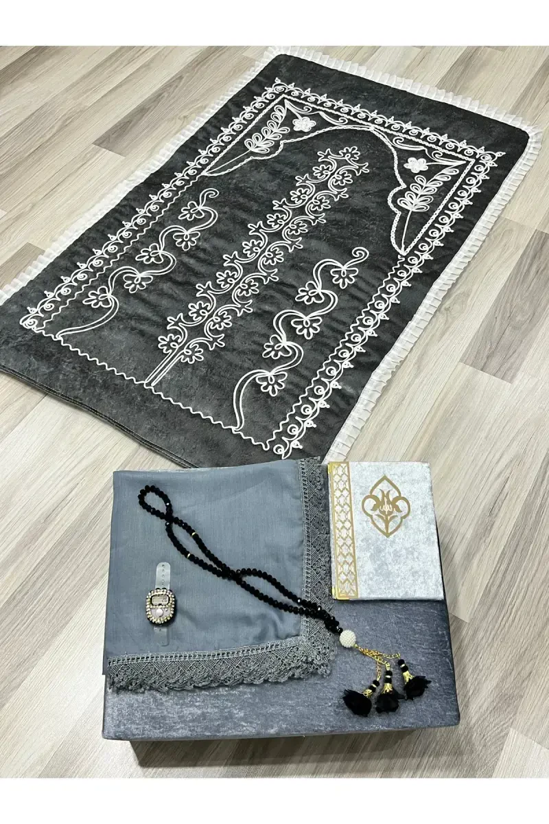 We offer a special, elegant and useful dowry set for couples who are getting married with the 6 Piece Velvet Prayer Rug Set. This special set is a stylish option that combines traditional and modern elements, carefully designed for both the bride and groom. Combining the nobility of gray color and the luxurious texture of velvet fabric, this set is a candidate to be one of the most valuable pieces of dowry chests.Each piece in the set has been designed with ease of use and aesthetic appearance in mind. The prayer rug allows you to perform your prayers in peace, while the bundle is an ideal solution for storing and carrying your personal belongings. The towel gently touches your skin with its soft texture, while the prayer beads help you increase your spiritual peace. Slippers are a stylish detail that you can easily use at home, while the chest allows you to safely store all these valuable pieces.The feeling of warmth and softness given by the velvet fabric turns this set into more than just an item, but also allows you to establish an emotional connection. Thanks to its inner sponge, the prayer rug maintains your comfort even during long prayers. The timeless elegance of the gray color appeals to all tastes, while the entire set is designed to match your home's decoration.This dowry set is not only for newly married couples, but also a meaningful and lasting gift option that you can give to your loved ones. It is an ideal choice to make your loved ones happy on special days and to show them that you value them. This set, which is sent with its stylish box, offers an unforgettable experience from the moment it is opened.The 6 Piece Velvet Prayer Rug Set is not just a beginning, but also a symbol of a lifelong union. While establishing your home with this special set, keep your traditions alive and experience the comfort of modern life.