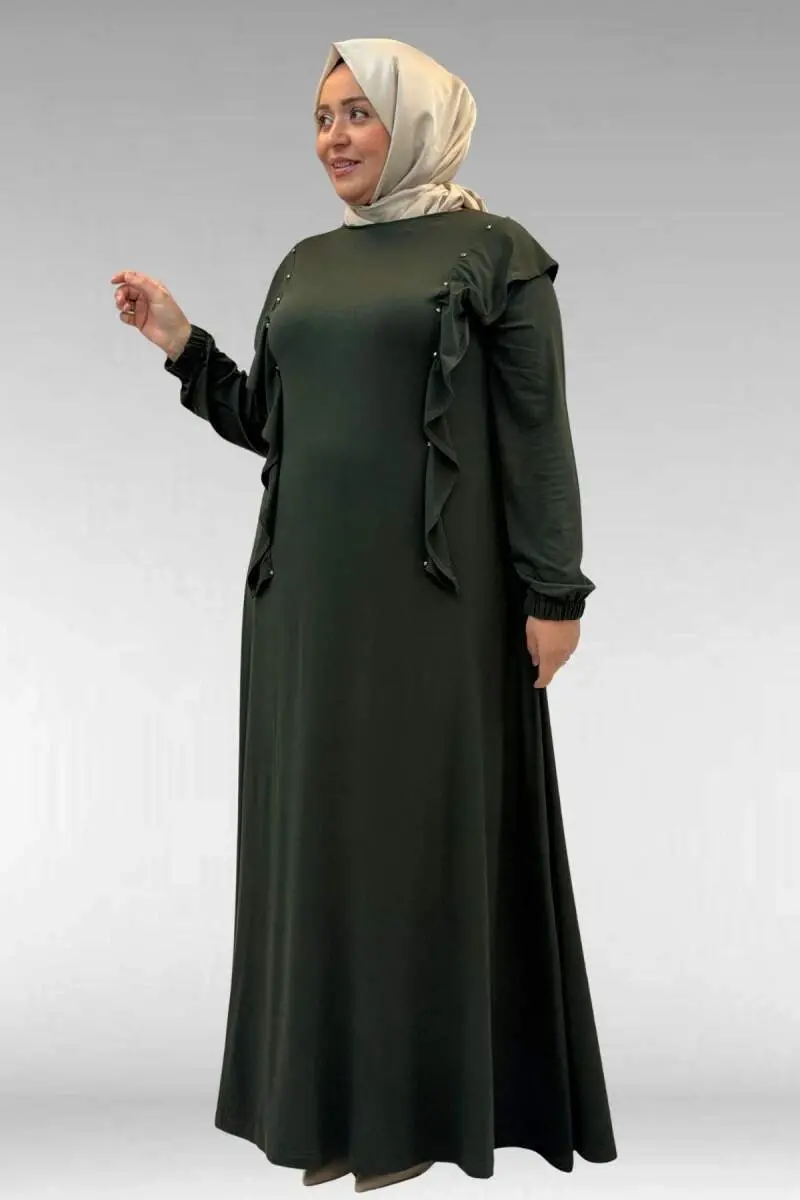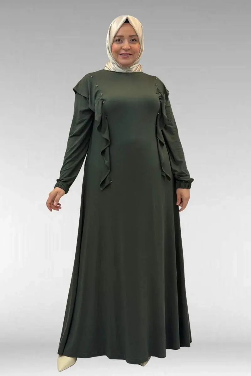 62003 Büyük Beden Omuzdan Aşağı Fırfır Detaylı Penye Elbise - Haki