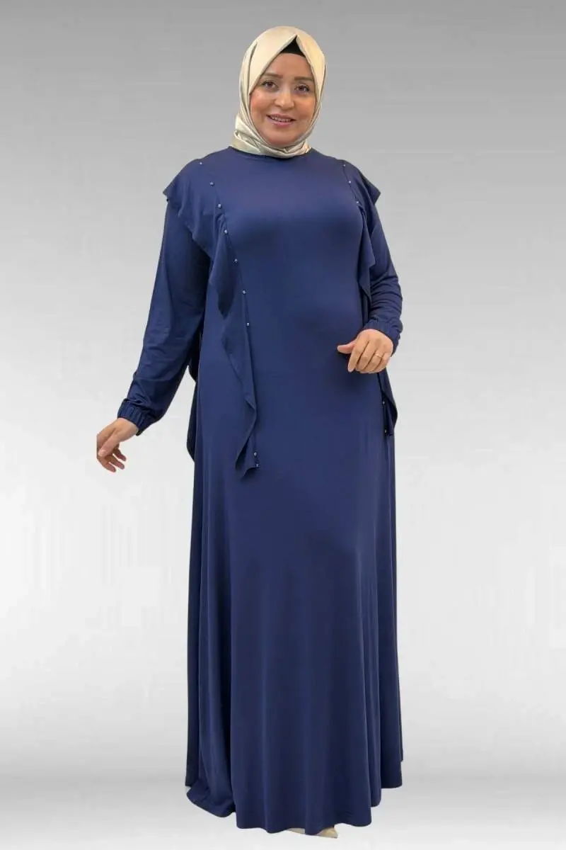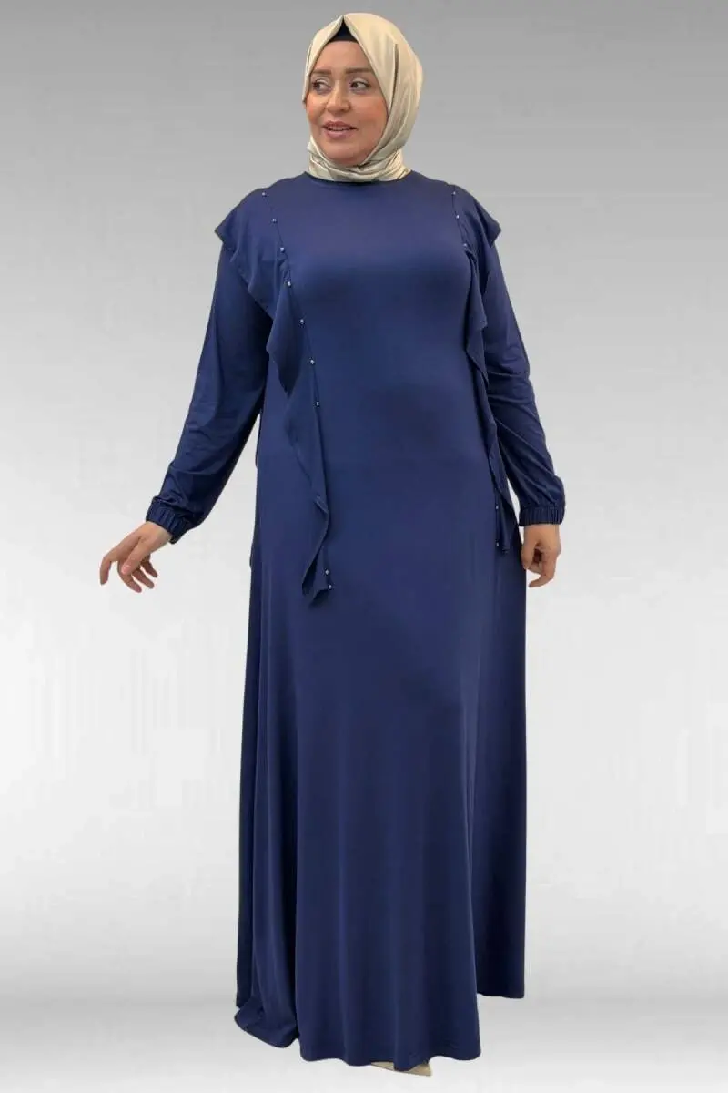 62003 Büyük Beden Omuzdan Aşağı Fırfır Detaylı Penye Elbise - İndigo