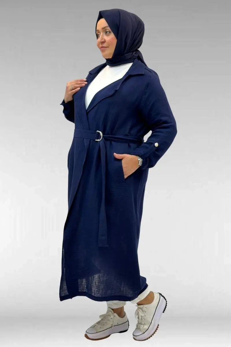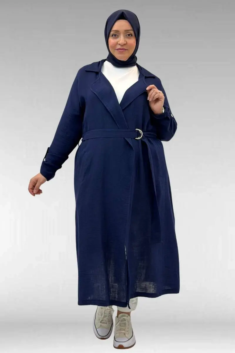63006 Büyük Beden D Halka Detaylı Müslin Trençkot - Lacivert