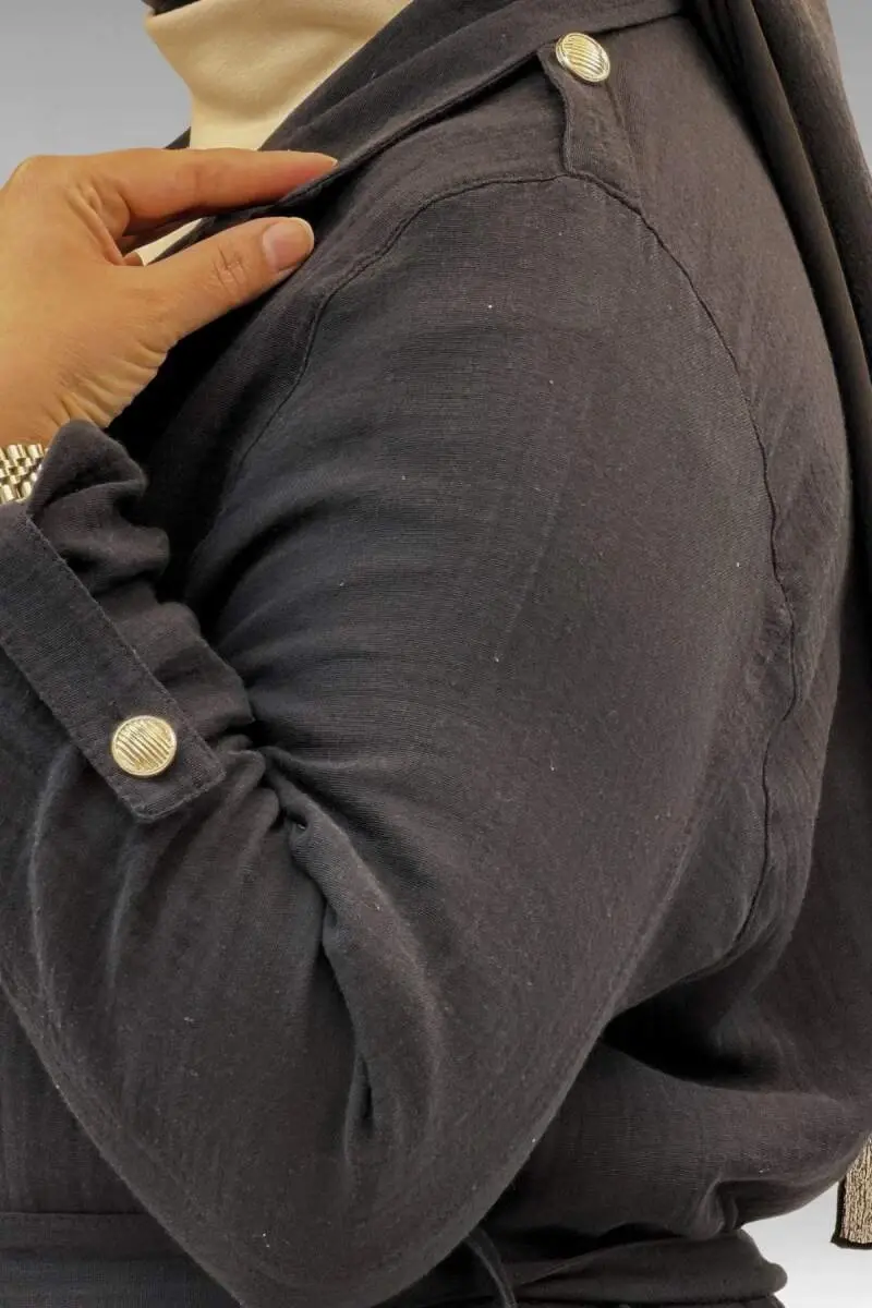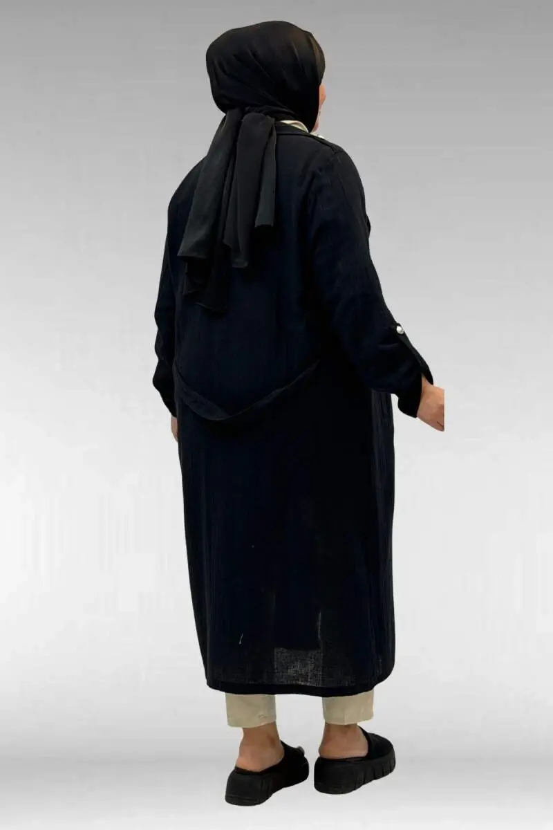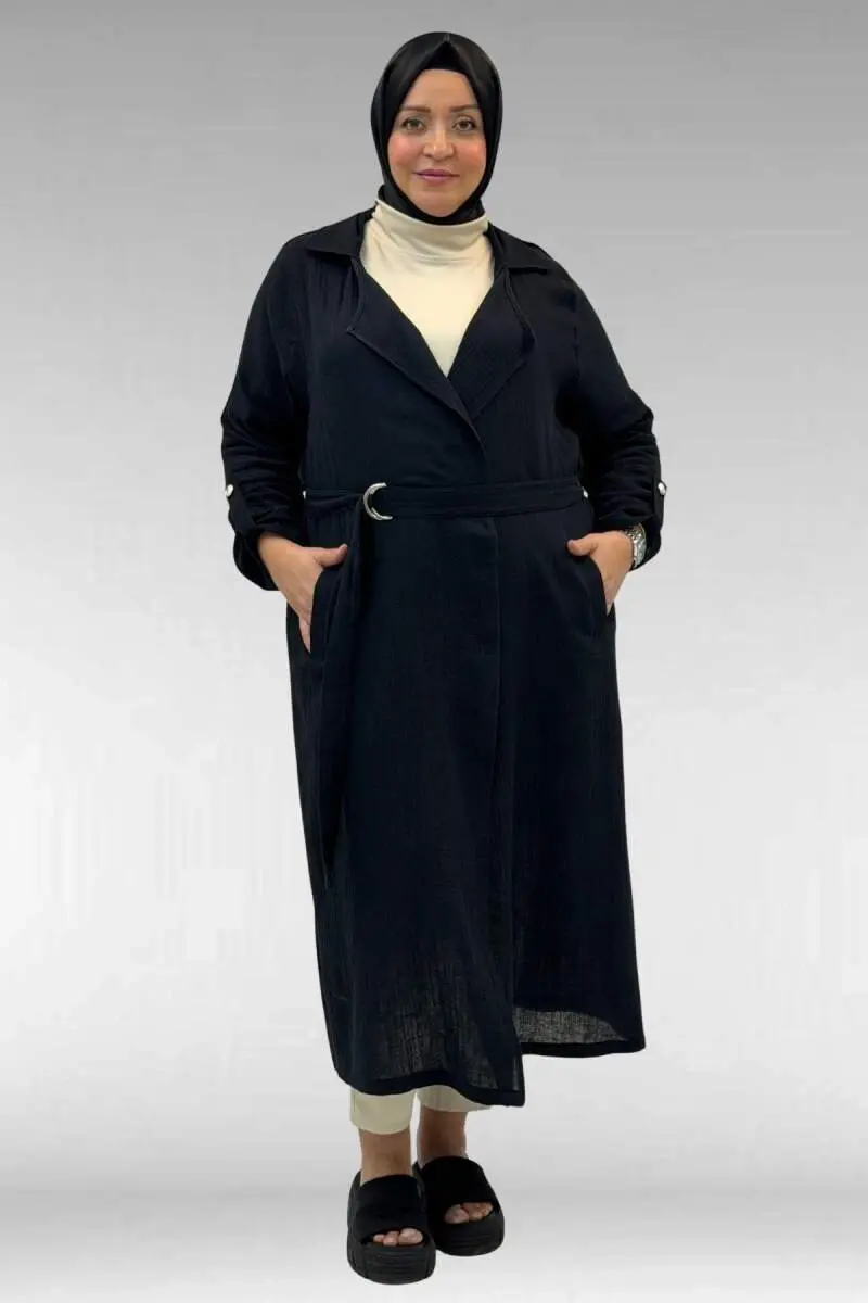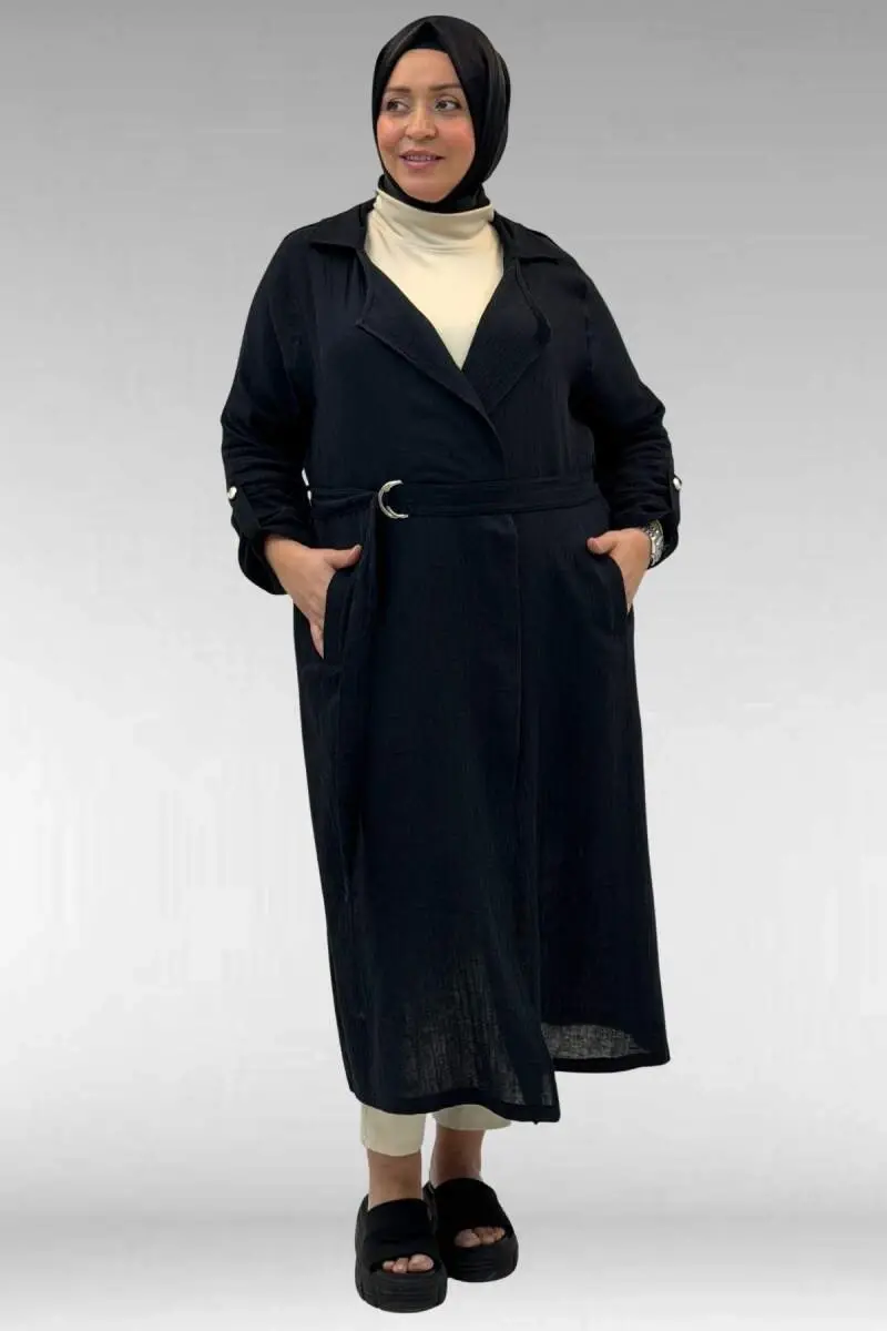 63006 Büyük Beden D Halka Detaylı Müslin Trençkot - Siyah