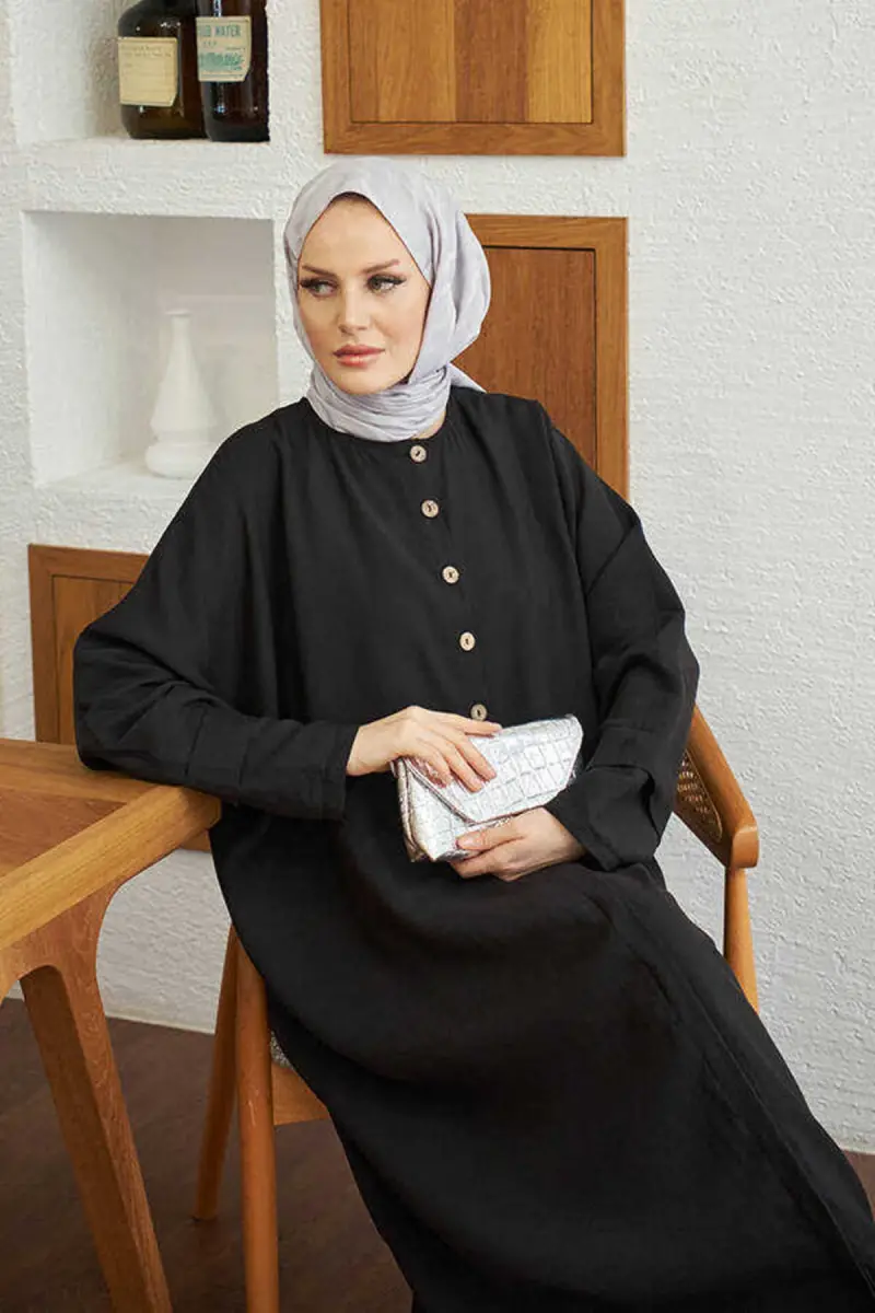 Сочетая элегантность и комфорт, 6618-Абайя из модальной ткани с декоративными пуговицами Черный готова стать незаменимой частью вашего гардероба. Сшитая из мягкой и легкой модальной ткани, абайя обеспечивает комфортное ношение в течение всего дня. Тщательно выполненные декоративные пуговицы придают абайе изящный вид.