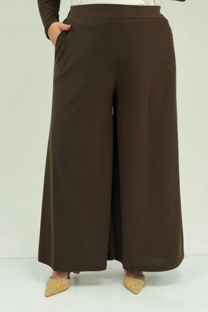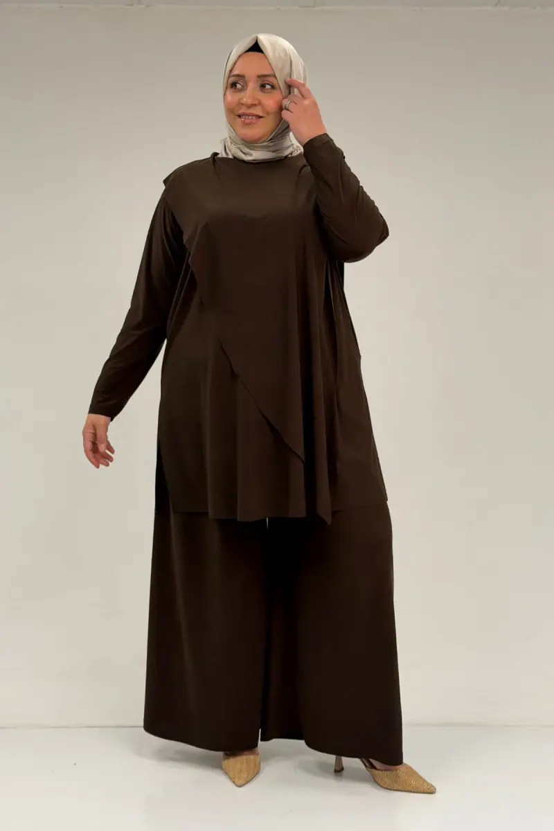 67004 Büyük Beden Önü Ve Arkası Pelerin Detaylı Sandy Pantolonlu Takım - Kahve